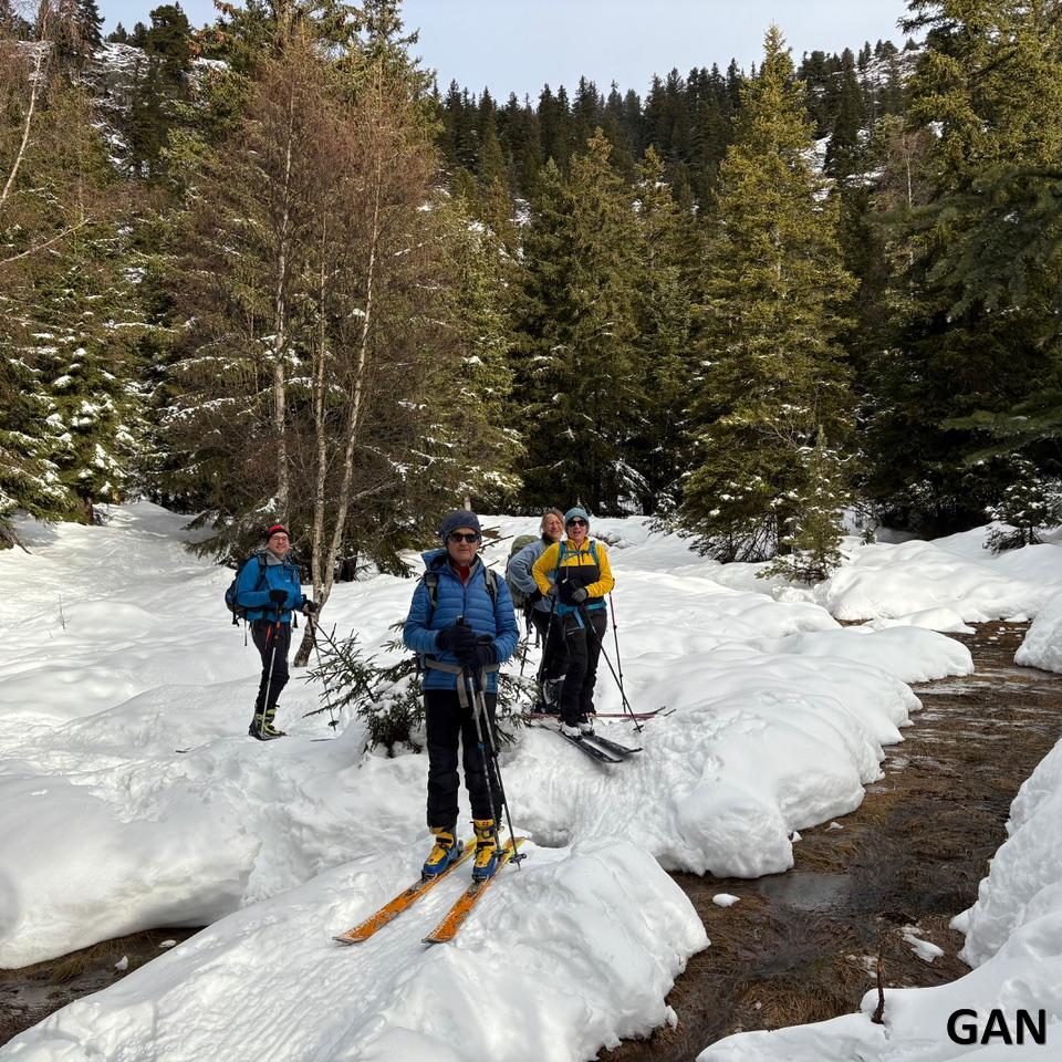 Arrivés à Chamrousse, nous voila le sourire aux lèvres, l’éclaircie annoncée il y 48 heures est bien présente. La pluie ayant fait son effet, le manteau neigeux est plombé, risque 1 jusqu’à 2200. Plus d’hésitation possible, direction le lac Achard, plus ludique que la montée en fille indienne le long des pistes.