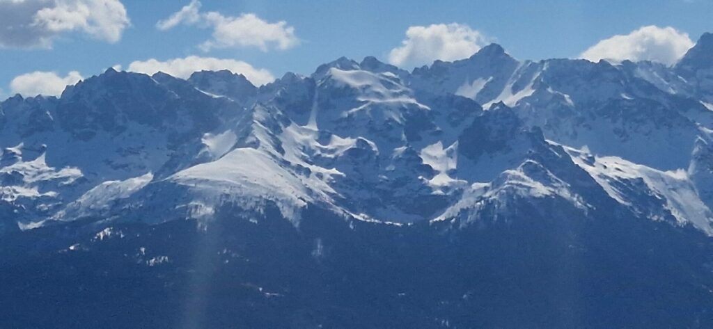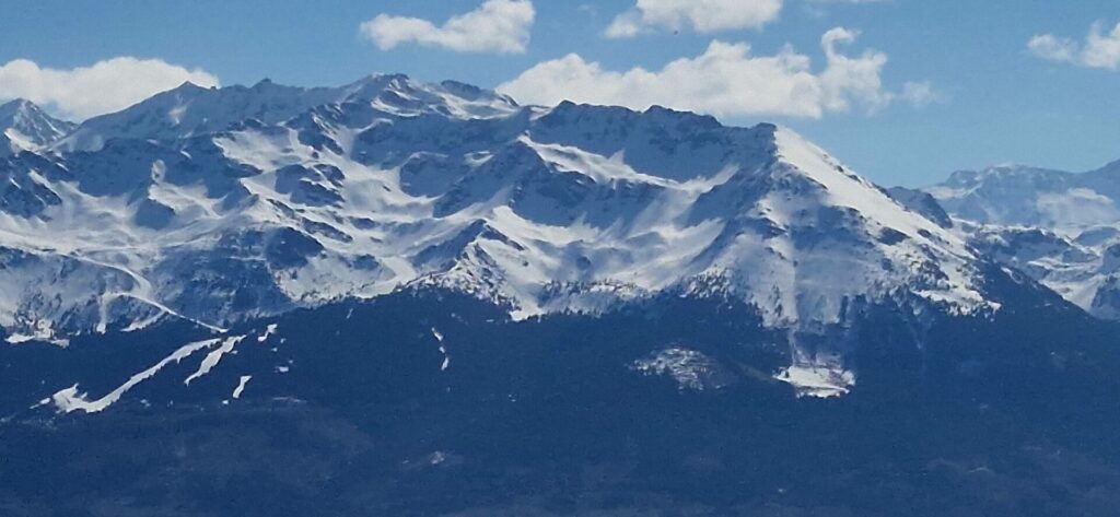 Regroupement effectué, nous empruntons le petit sentier qui permet d’accéder sans difficultés le très joli point de vue de Château Nardent(1225m). Face à nous s’étend toute la chaîne de Belledonne enneigée, nous en prenons plein les yeux….. mais le sommet est trop exigu pour y faire la pause pique nique….