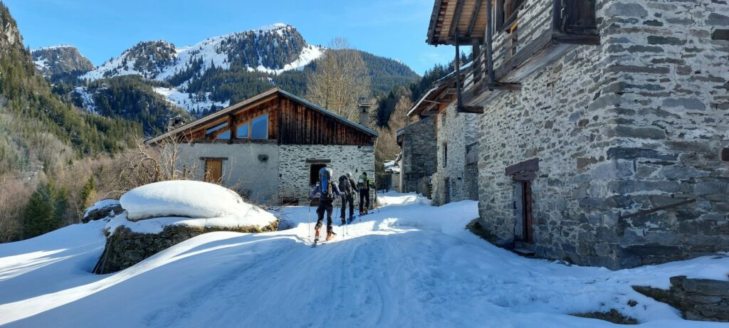 Mardi 17 mars : départ de la Masure (1200 m) à 9h pour 7km de route enneigée. Nous traversons les hameaux du Crot et de la Savonne.