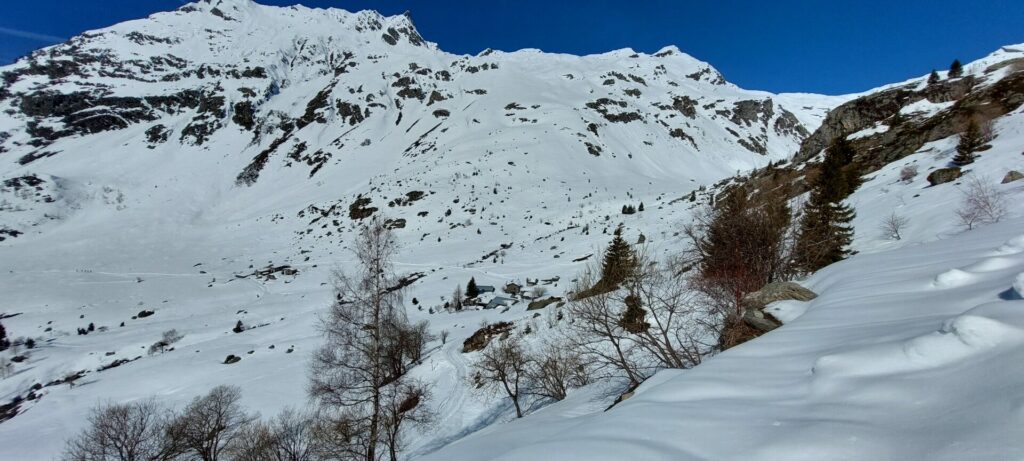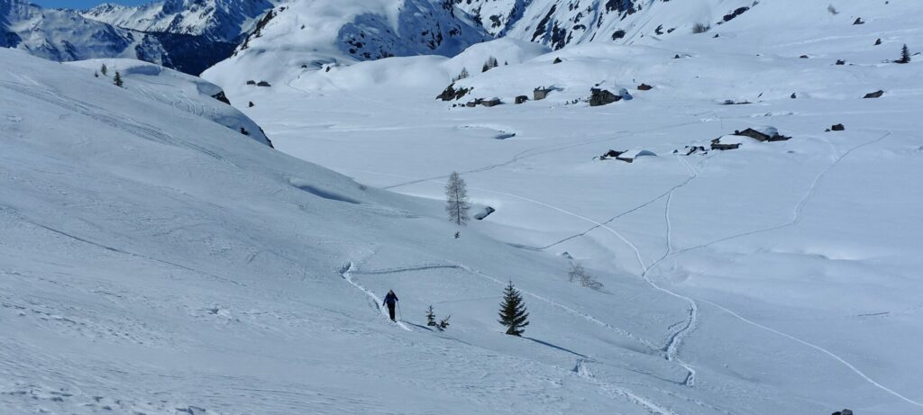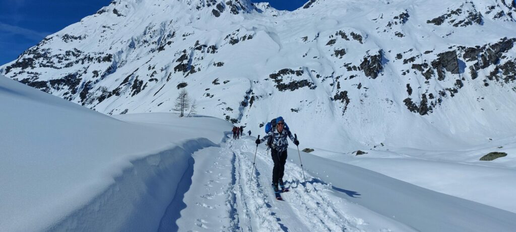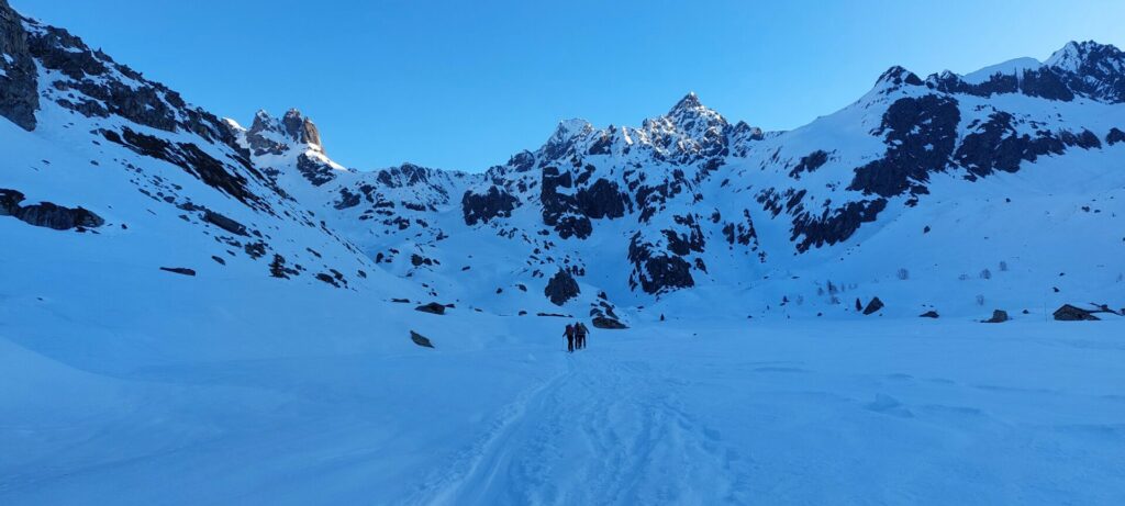 Ce fond du vallon italien est splendide, vierge de traces, nous sommes les premiers à passer après la chute de neige de samedi.