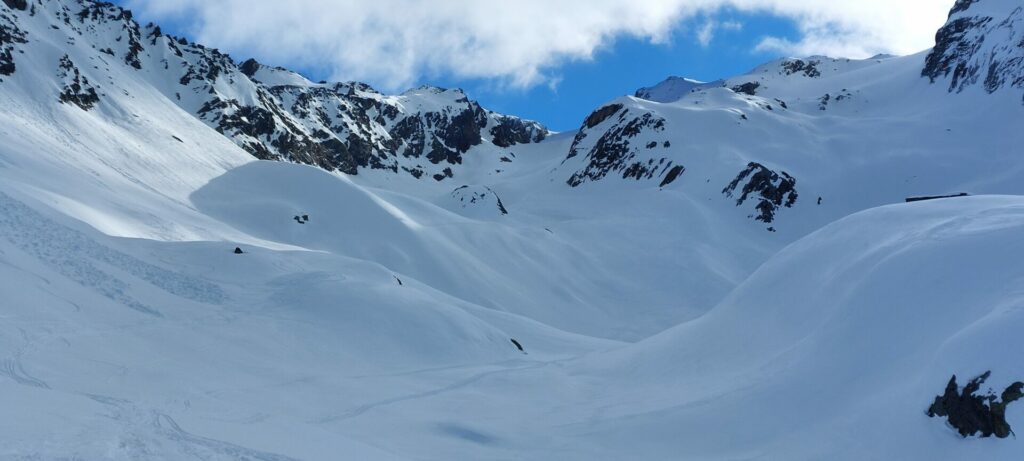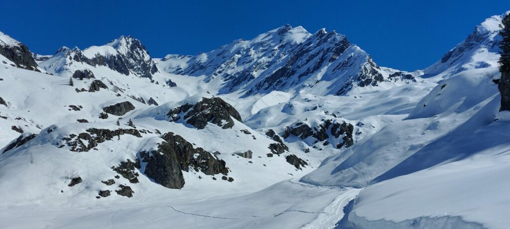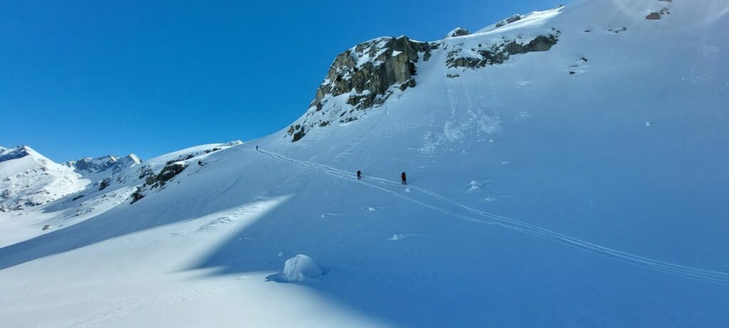 Jeudi 19 mars : Nous démarrons à 8h du refuge avec nos sacs lourds car nous avons choisi de faire la boucle secrète Tachuy – Louie. Nous bifurquons un peu trop tôt à l’ouest, à 2200m, sous les pentes du Mont Charvet, mais nous retrouvons l’itinéraire classique à 2320m, au dessus du lac du petit.