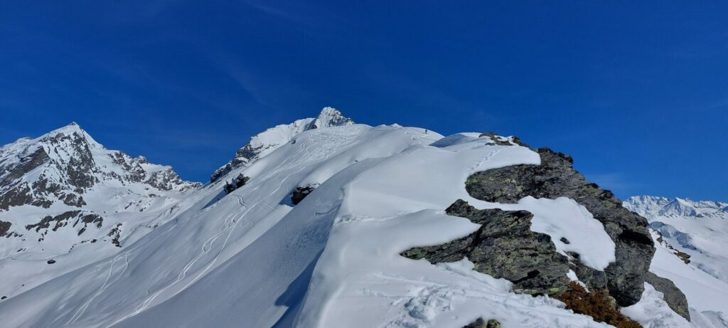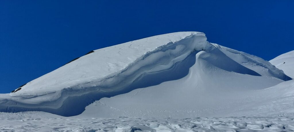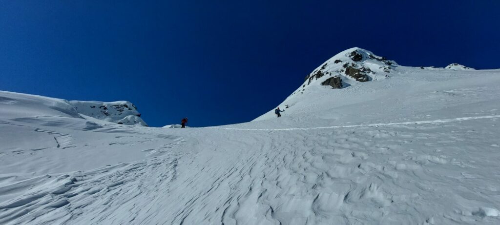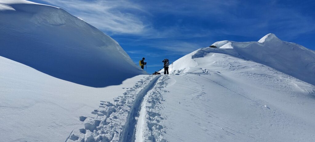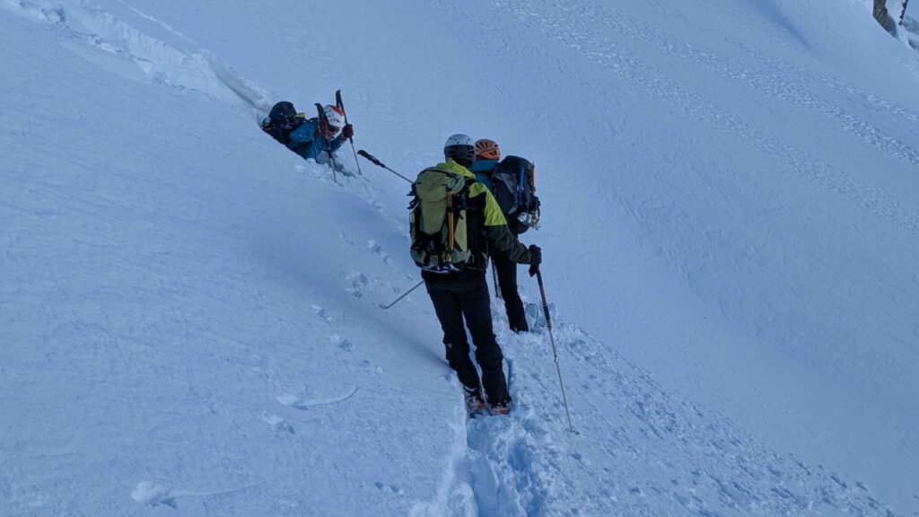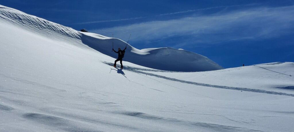 Les traces des chasseurs alpins sont de jolis rails qui vont nous amener au col du Grand à 3100m. Nous dépeautons rapidement et subitement c’est comme si la lumière s’éteignait. Plus aucune visibilité, plus de repères, ni à gauche, ni à droite, ni au Nord, ni au Sud mais où se trouve la descente ?