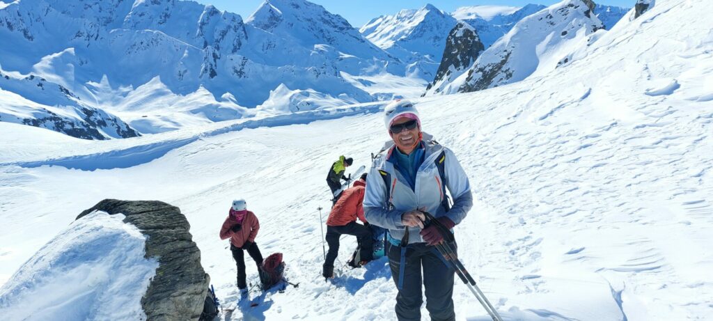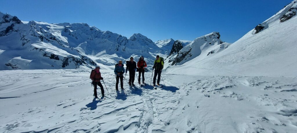 Nous partons avec tout le matos de glacier en direction du glacier du Grand, ébahis par tous ces sommets qui nous entourent.