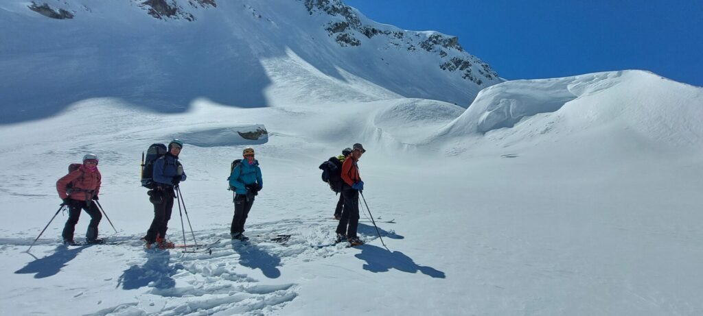 Mais c’est déjà l’heure du point météo pour la journée de jeudi. « Grande journée printanière, et pas de vent », ces prévisions autorisent toutes les audaces, surtout que le gardien Morgan nous susurre une petite boucle derrière le col de Tachuy qui bascule en Italie et qui permet de rejoindre la Savonne par le col de La Louie.