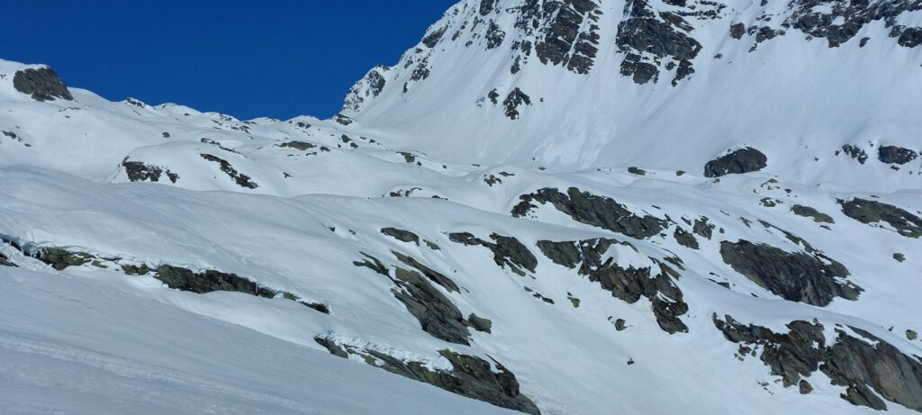 On dépeaute pour la dernière fois….mais l’aventure réserve parfois des surprises. L’itinéraire de ski sur la carte IGN passe nettement vers l’ouest mais nous amorçons la descente au Sud. La neige est encore croutée et soufflée. Nous sommes arrêtés à 2370m par de gros blocs fissurés, nous allons chercher un autre passage plus bas. Des grandes dalles interdisent à nouveau le passage et ….il va falloir repeauter sur environ 100m de D+ pour retrouver l’itinéraire tracé en bleu sur la carte.