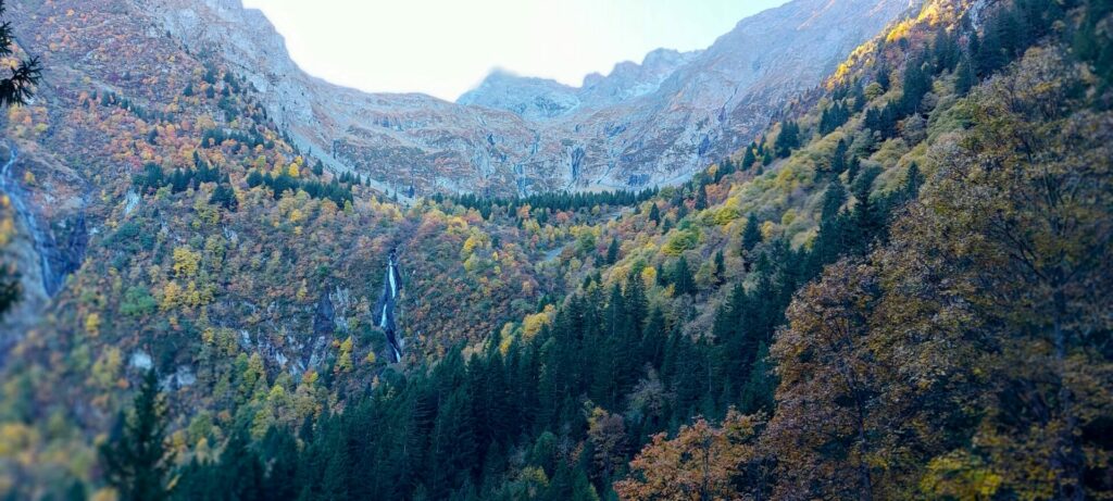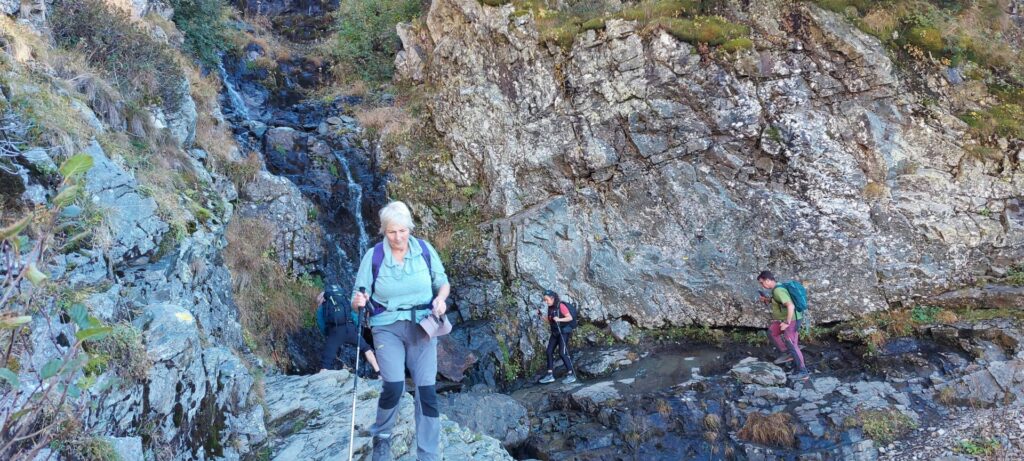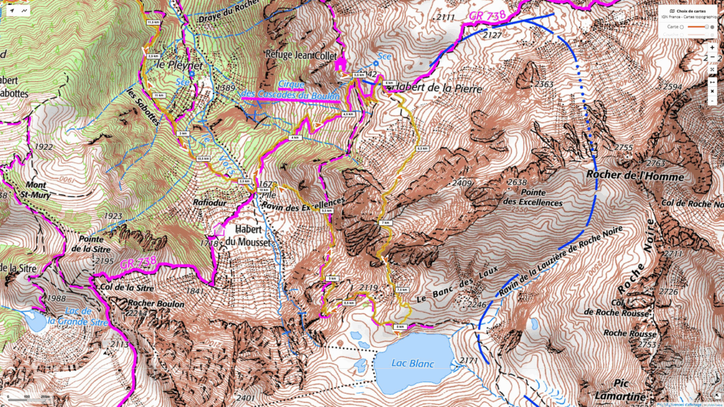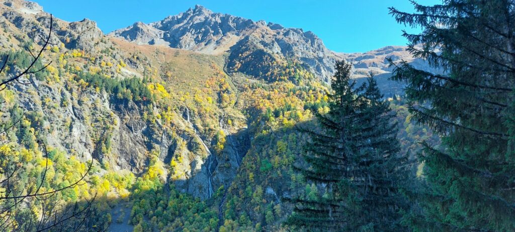 Départ du parking de la Souille (1360m) par un sentier en balcon jusqu’au pont du Habert du Mousset (1680m). Le paysage s’ouvre sur le cirque des cascades du Boulon, on en prend plein les yeux.
