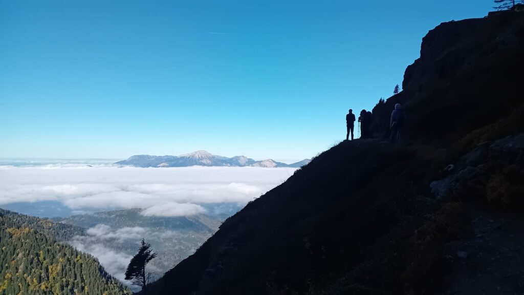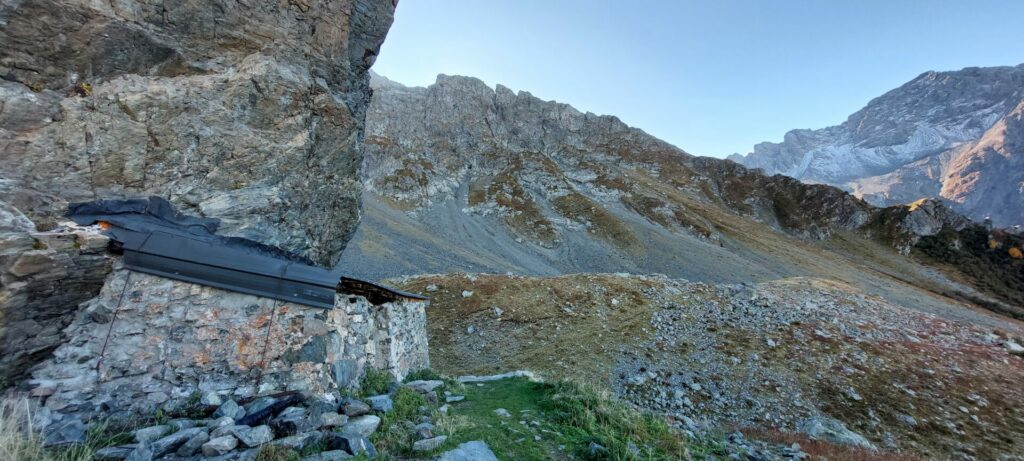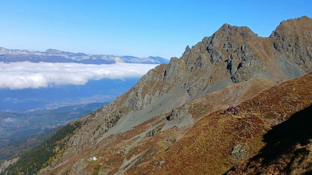 Nous surplombons le Refuge Jean Collet pendant que la mer de nuage se délite.
