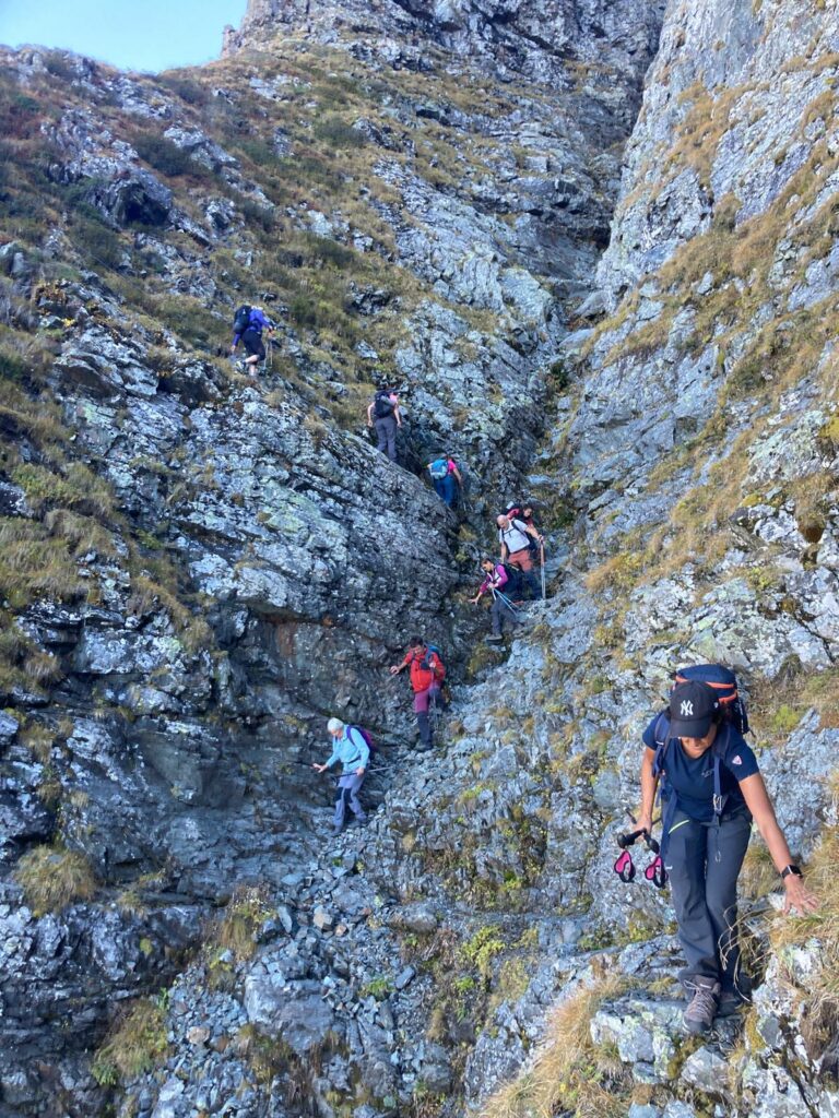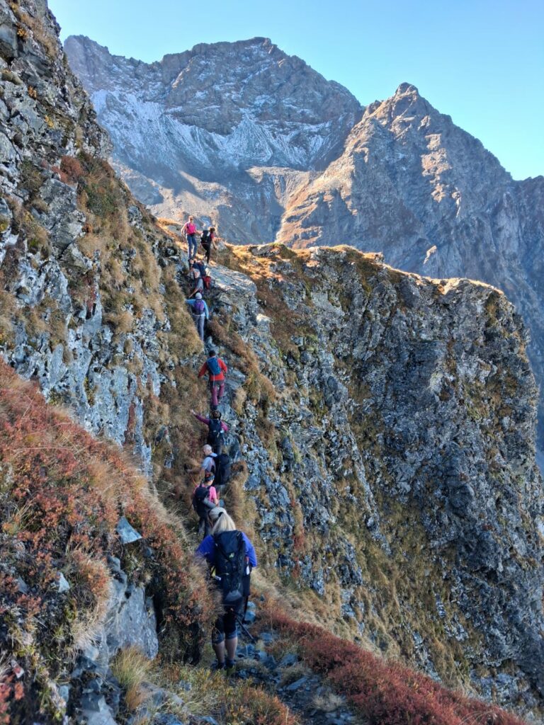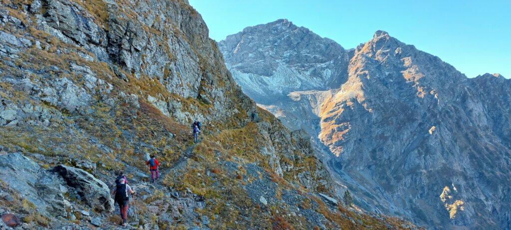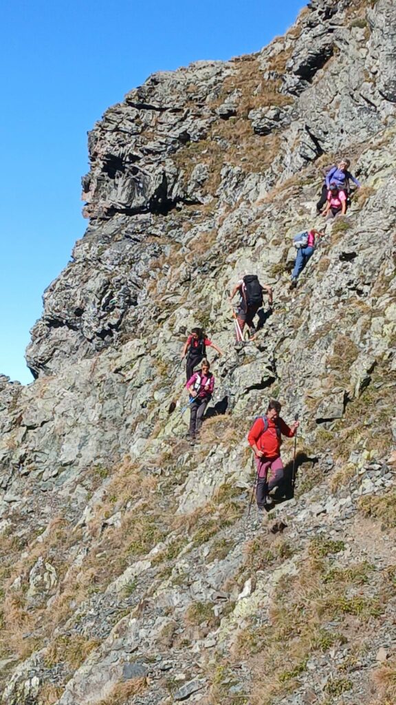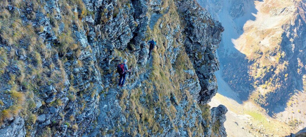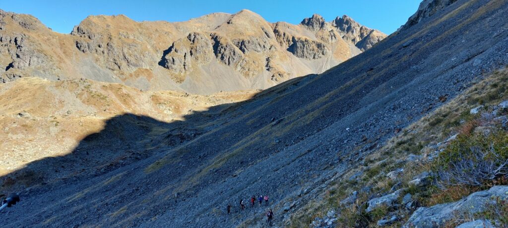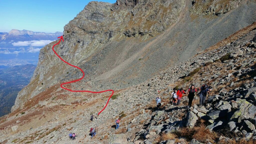 Après une traversée d’éboulis, on rentre dans le vif du sujet. Le tracé de la vire est bien marqué, mais la concentration est de mise.