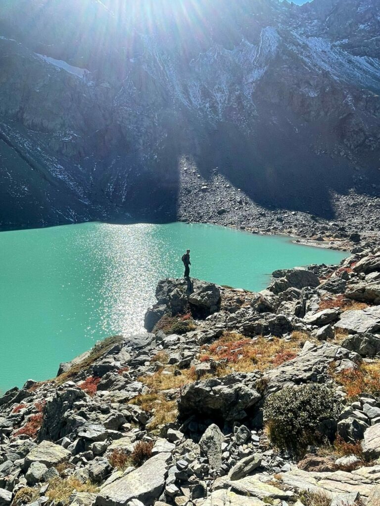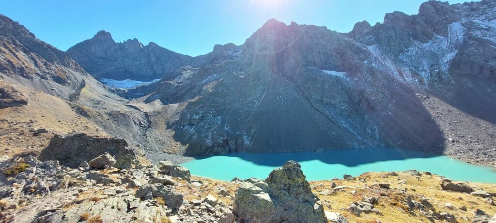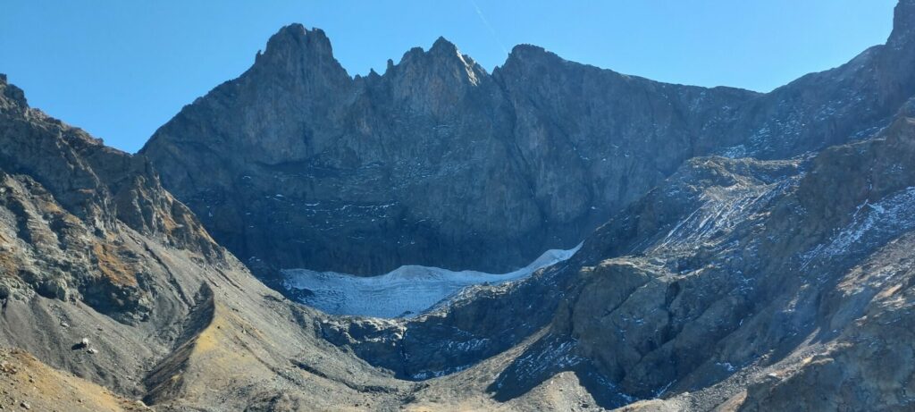 Un dernier coup d’oeil sur le lac blanc, le Grand Pic de Belledonne, le glacier de Freydane et la vire des excellences.
