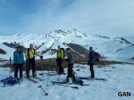 Sophie et Bernard avec 10 personnes descendent pour pique-niquer à l’abri du vent et réaliser des exercices de recherche DVA pour les personnes qui n’ont pas encore eu le temps de le faire. La descente directe se fera sur la croupe (neige pas trop transformée mais correcte) puis le groupe empruntera la piste noire jusqu’en bas en bonne neige.
