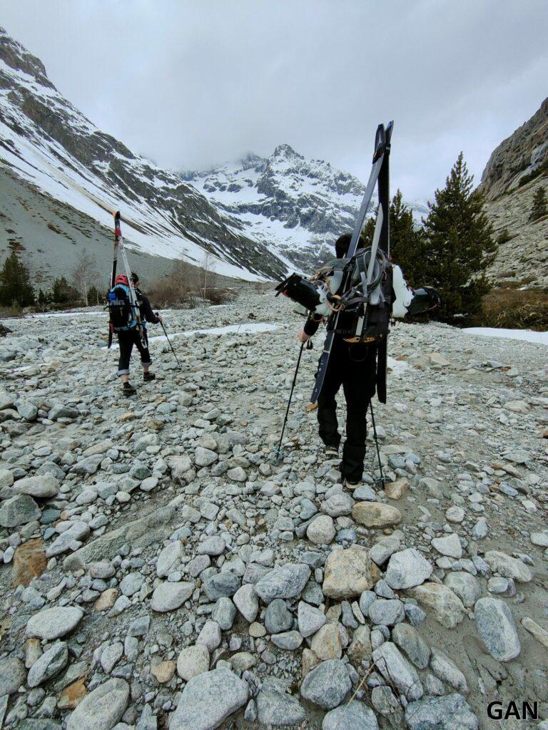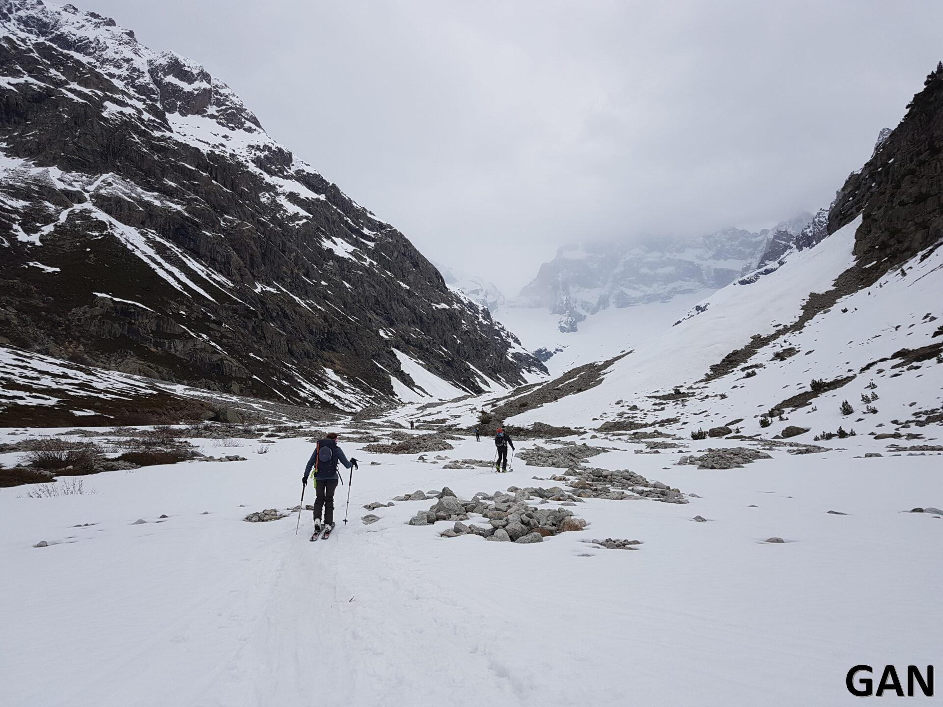 Après beaucoup d’hésitations au regard de la météo très changeante, la sortie a été maintenue. 8 randonneurs sont au départ samedi à 14h00 pour une arrivée prévue à 18h00 au refuge. Sortis de la voiture, nous mettons les skis sur le sac, certains en basket d’autres en chaussures de ski. Montée au refuge par la rive droite du torrent des Etançons, sentier plus court que la rive gauche mais aussi plus escarpé. Les 2/3 du dénivelé seront fait à pieds mais seulement la moitié de la distance. Nous arrivons tous à skis au refuge un peu avant 18h00. La neige est lourde.