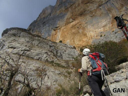La balade démarre de la route par un couloir pierreux raide et étroit où il faut de temps en temps se tirer sur les buis ou sur une vieille corde. Ce couloir vient buter sur la falaise impressionnante, verticale voire surplombante sur plusieurs centaines de mètres. Vu de là, la suite paraît plus qu’improbable. Nous longeons la falaise vers la droite jusqu’à arriver au pied de la fameuse rampe de Chorange.