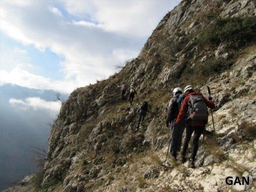 Nous arrivons au sommet de la rampe accueillis par un vent froid. Après s’être décordés nous continuons le sentier et nous remontons par le plateau en longeant les falaises. Nous voyons le point d’où se sont élancés les base jumpers. Nous déjeunons quelque part sur la crête avec une très belle vue sur les gorges de la Bourne et la vallée de Saint Julien en Vercors. Nous continuons notre promenade le long des falaises sur un sentier de moins en moins visible jusqu’à trouver un très beau panneau indiquant « Torquemada » le sentier est bien marqué nous nous y engageons mais ce beau sentier se termine en plein milieu de la falaise sur des amarrages de rappel ; demis tour !