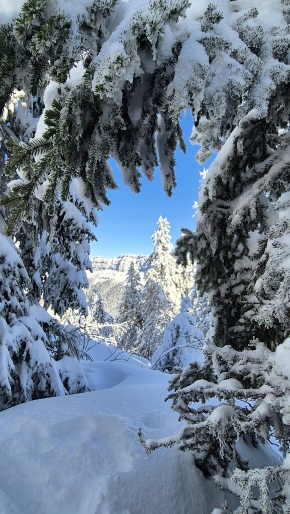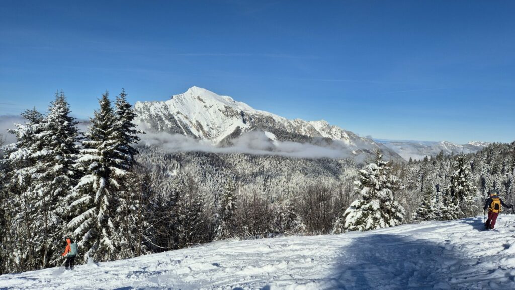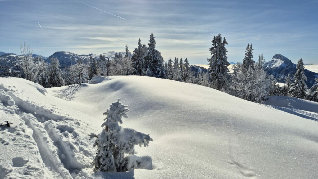 La descente est entamée sur le versant Ouest pour rejoindre la piste du Creux de la neige. que nous dévalons dans une poudreuse légère.. Mais déjà bien trafolée, après une descente en forêt bien ouverte nous rejoignons la combe de l’Ours que nous suivons jusqu’à proximité du hameau du Batour, puis par une piste verte, nous rejoignons les pistes de St Pierre .
