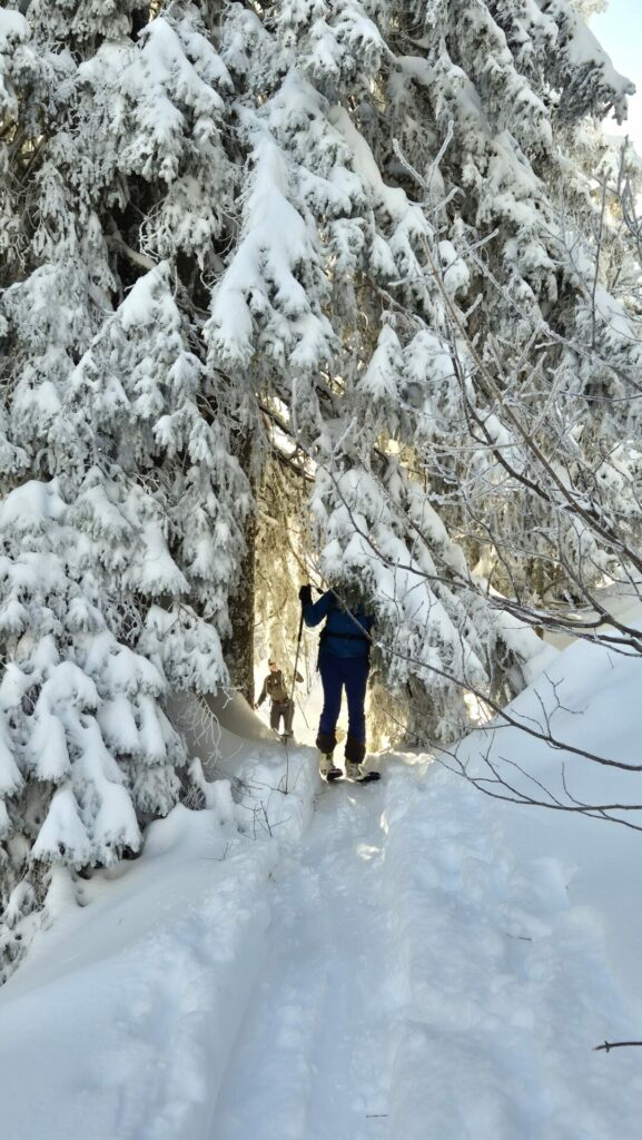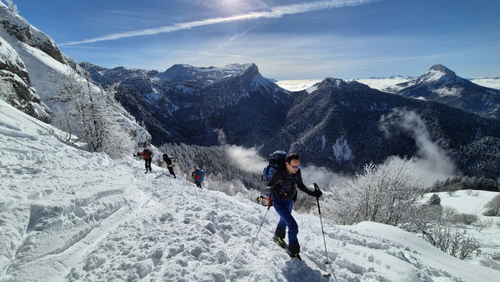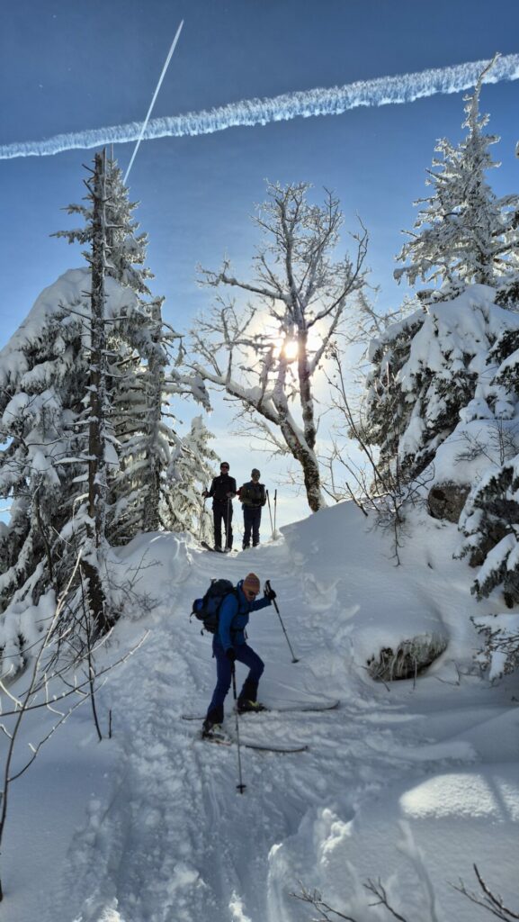 Pour nous, après l’inertie du départ, avec le parking, puis le double test DVA , nous voilà partis, allègrement, sur l’une des nombreuses traces de montée en direction des Essarts.