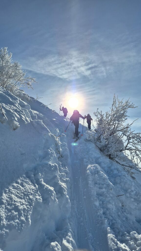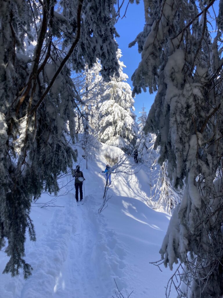 A partir de là, changement de décor : fini les larges pistes non damées de la station , Nous entamons la montée raide et quelque peu scabreuse de l’arête ouest du Bec de la Scia(1783m). À partir de cet endroit, la sélection naturelle se fait, car il faut même déchausser sur environ 20m de dénivelé entre rochers et arbustes, pour rechausser plus haut et atteindre ce premier sommet avec sa table d’orientation. À ce premier sommet, le groupe de 10 s’est reconstitué.