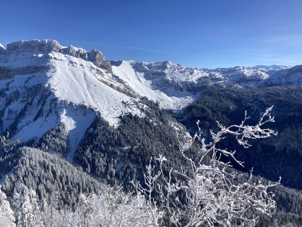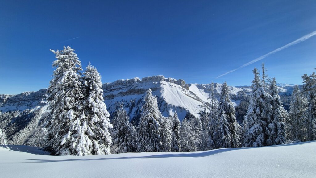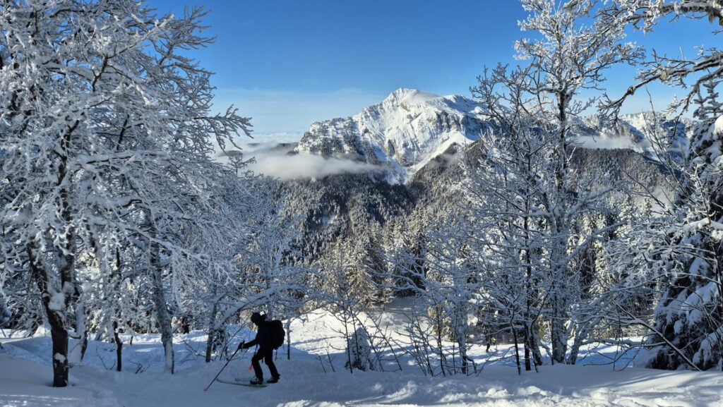 Nous pouvons aussi nous émerveiller devant les très belles pentes surmontées des falaises des lances de Malissard, qu’un skieur de rando isolé est en train de gravir.