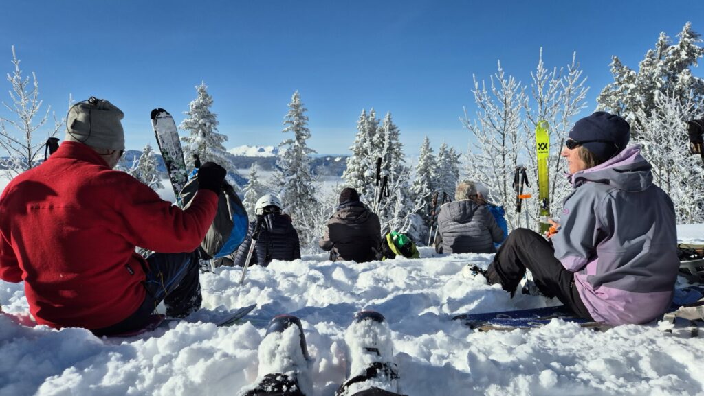 Nous montons à un rythme tranquille…. sans doute un peu trop, car trois membres de notre équipe, avec l’accord de tous, décident de partir devant, afin d’entamer une première descente à partir du refuge restaurant de la Scia., au vu de la qualité de la neige poudreuse .