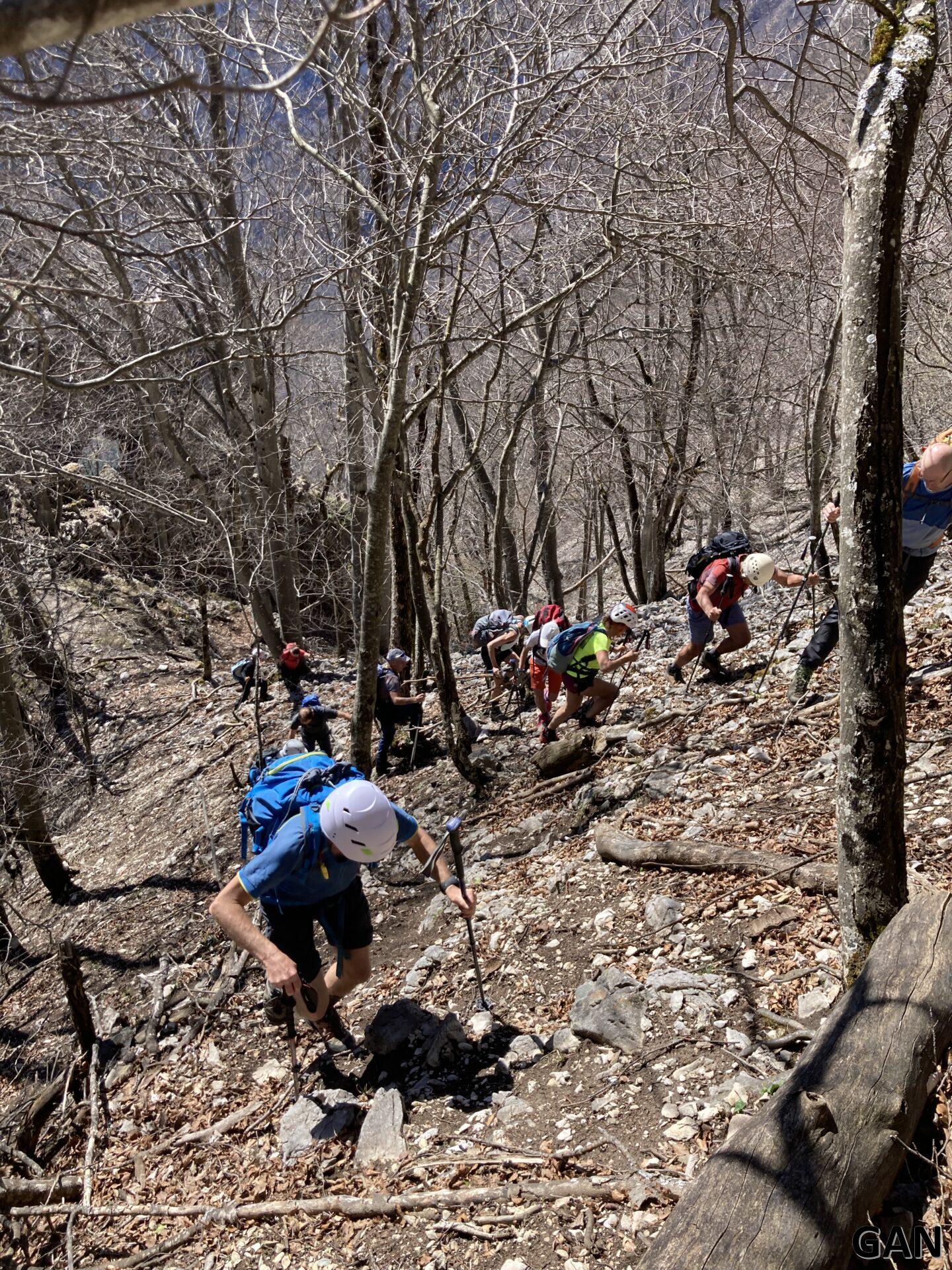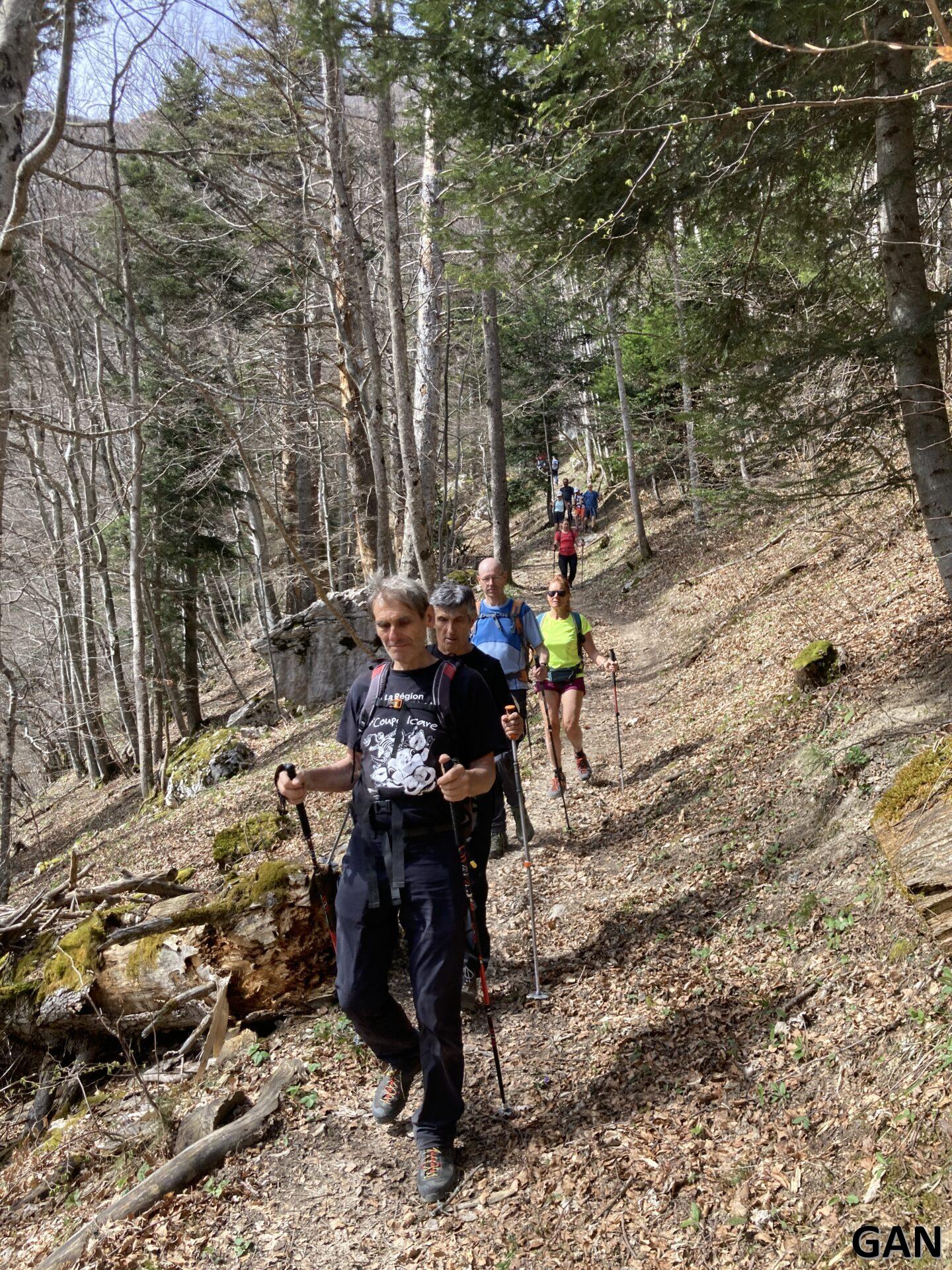 Nous démarrons à 9h et il fait déjà déjà chaud. Nous remontons une piste et dès que nous la quittons, au bout de 10 minutes, il nous faut monter dans la forêt au jugé dans une pente très raide en terre dans laquelle il n’y a aucune trace. Nous remontons jusqu’à buter au pied des falaises et là ce n’est guère plus simple car il n’y a toujours pas de trace, les pentes sont raides, quelques couloirs ont arraché le peu de terre, nous cheminons dans des pentes d’herbes raides. Sombardier avait conseillé de prendre un casque et il a très bien fait car sous les falaises tout peut arriver et de fait nous avons dû déranger un chamois car à un moment une pluie de gravier nous tombe dessus heureusement sans mal, même si Monique en reçu une pierre sur le genou. Quelques passages sont scabreux, pas vraiment dangereux mais toujours raides et inconfortables : c’est la progression « sanglier » que j’avais promise au départ. Nous poursuivons au pied des falaises dans les pentes, en passant sur et sous les arbres, en se cramponnant à ce qu’on trouve, mais bizarrement dans la bonne humeur, je ne me suis pas encore fait insulter loin de là, tout le monde a l’air d’être ravi de circuler dans un milieu totalement improbable dans une nature sauvage et vierge.