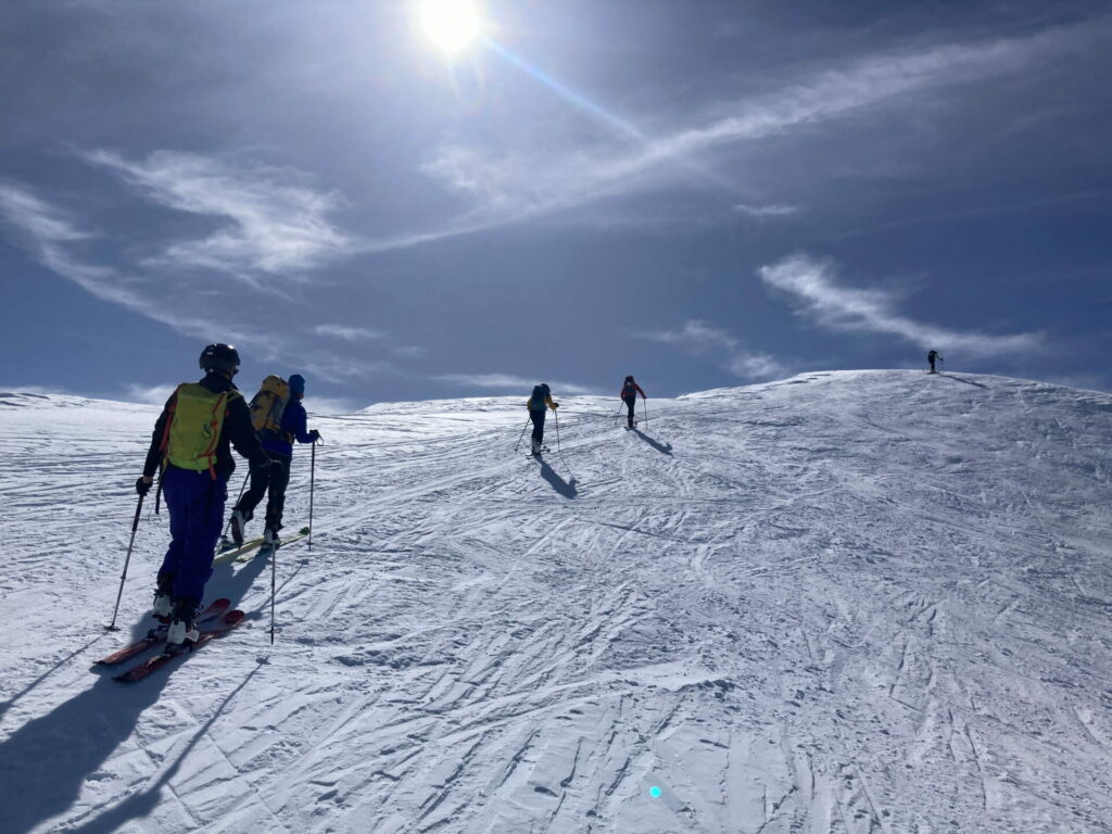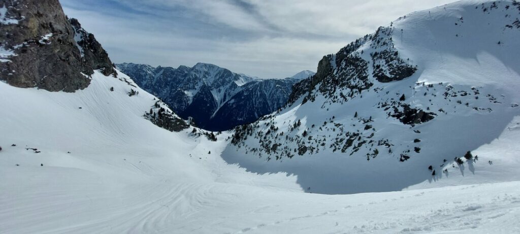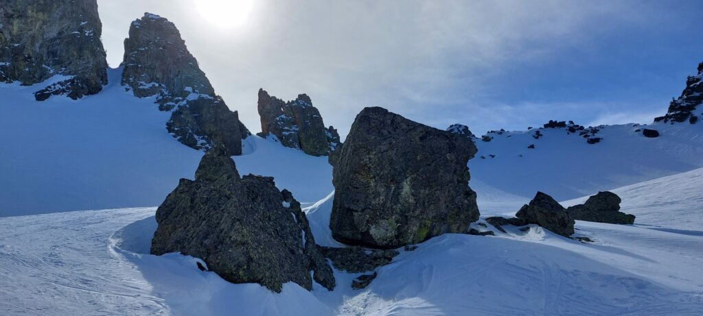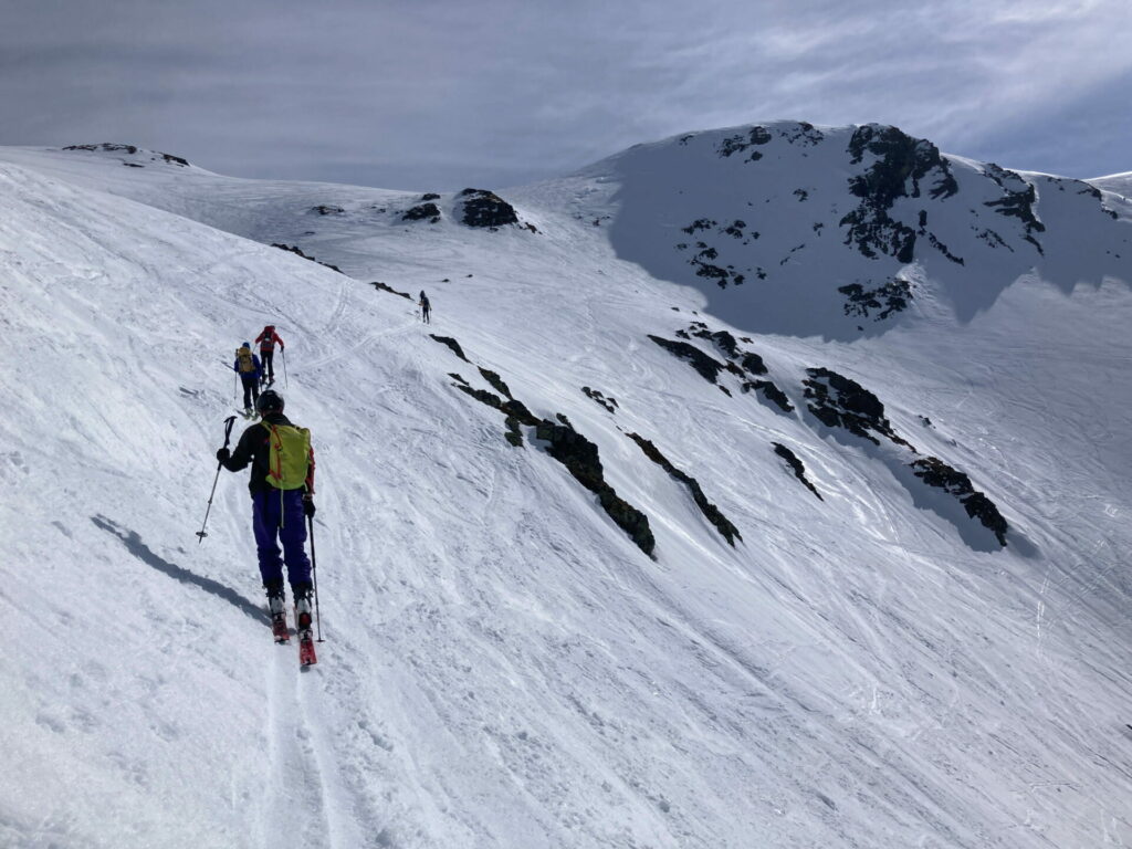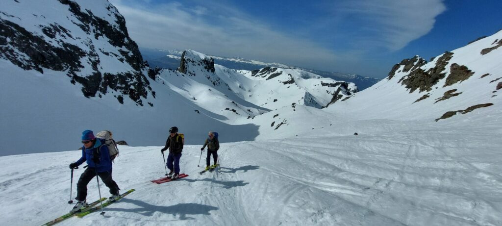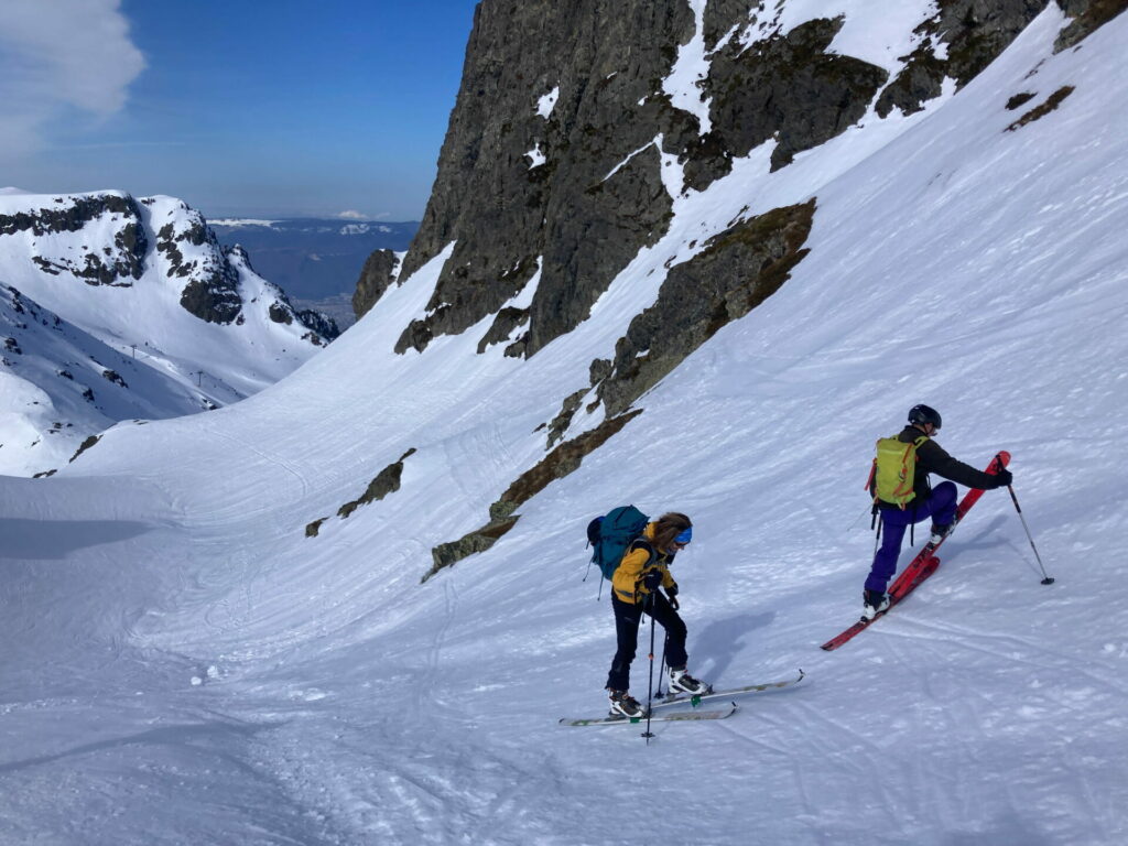 Les versants à l’ombre sont encore un peu gelés mais comme la neige a bien décaillé au soleil, la descente est très agréable. Nous passons au dessus du lac des Escombailles avant de repeauter pour remonter à la Croix.
