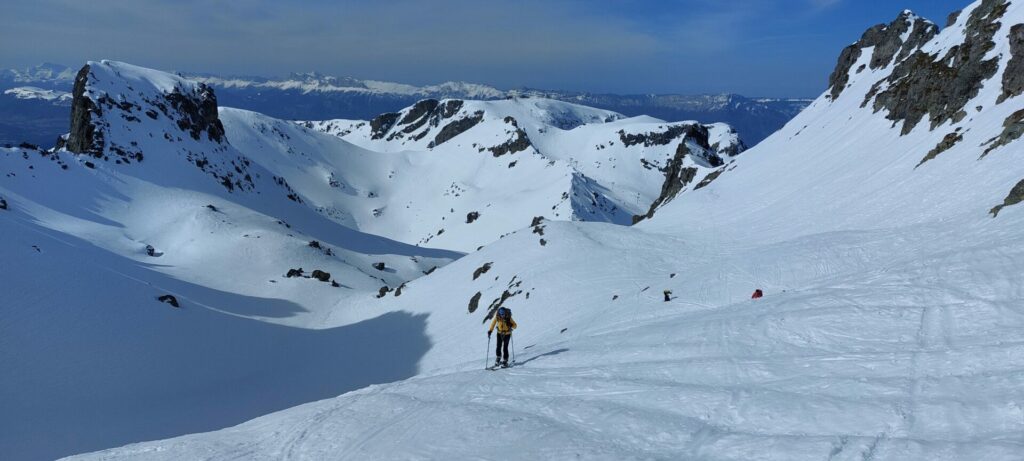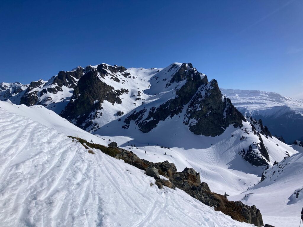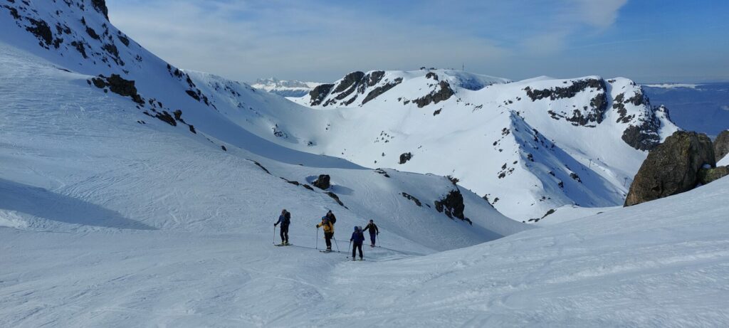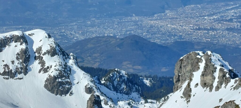 Nous démarrons à 9h20 de Bachat Bouloud et sommes à la Croix de Chamrousse par l’itinéraire de rando. La neige est encore gelée. Nous rejoignons rapidement le col de la botte puis le col de Lessines à 2100m. La pente raide au début de la montée est déjà au soleil, nous mettons les couteaux.