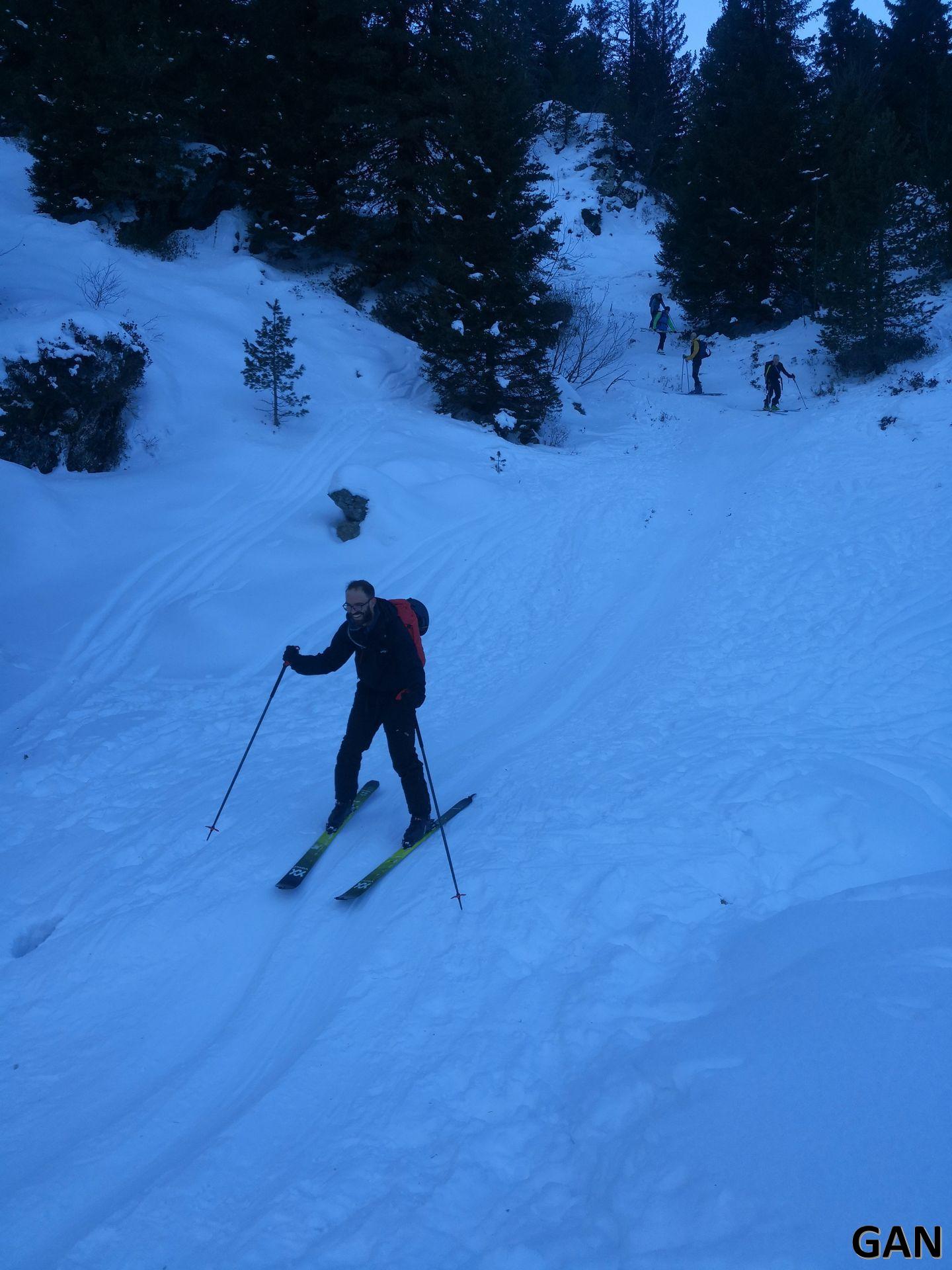 Le test en double du DVA est réalisé et nous nous élançons à 8h45 ; vite pour nous réchauffer, droit dans la combe de Casserousse comme il est de norme avec le chemin tracé pour les randonneurs. Les passages étroits en forêt sont assez faciles. Moins la petite descente avant le lac des Pourettes, qui aujourd’hui est plein de cailloux. En parlant de cailloux, le ressaut depuis le lac est lui extrêmement difficile à négocier. Je suis le seul à conserver mes skis aux pieds, tous les autres les enlèvent. C’est bien sûr le bon choix à faire même si le défi annoncé me fait persévérer dans le peu de prudence. Le ressaut est quand-même peu haut et peu exposé.