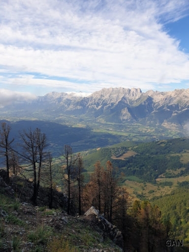 Très beau panorama à 360 degrés avec le Dévoluy de l’Obiou au pic de Bure, le massif des Écrins avec le Sirac, les Bans, la barre des Écrins, la Meije, le Rateau.