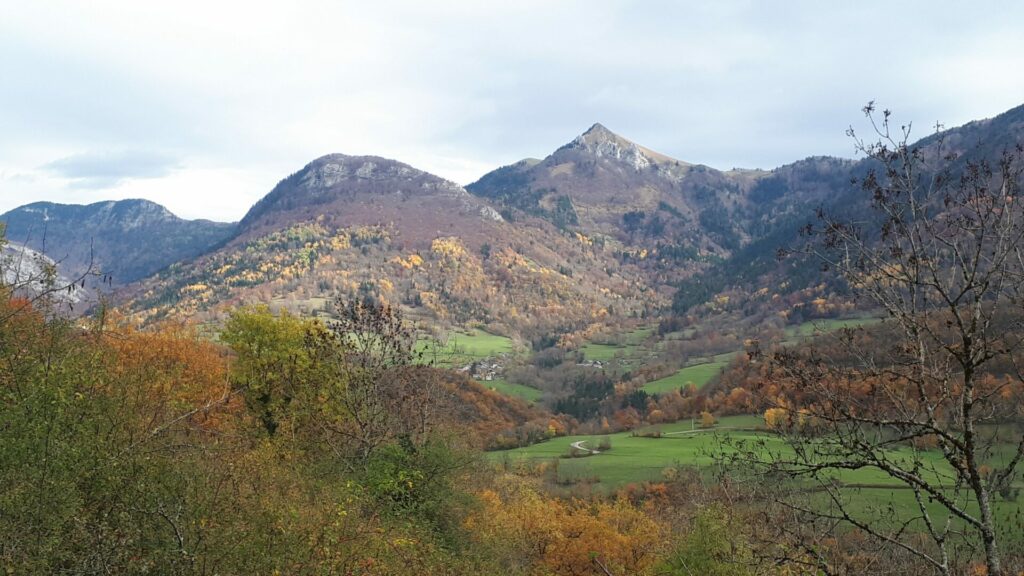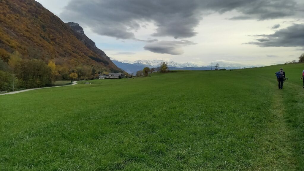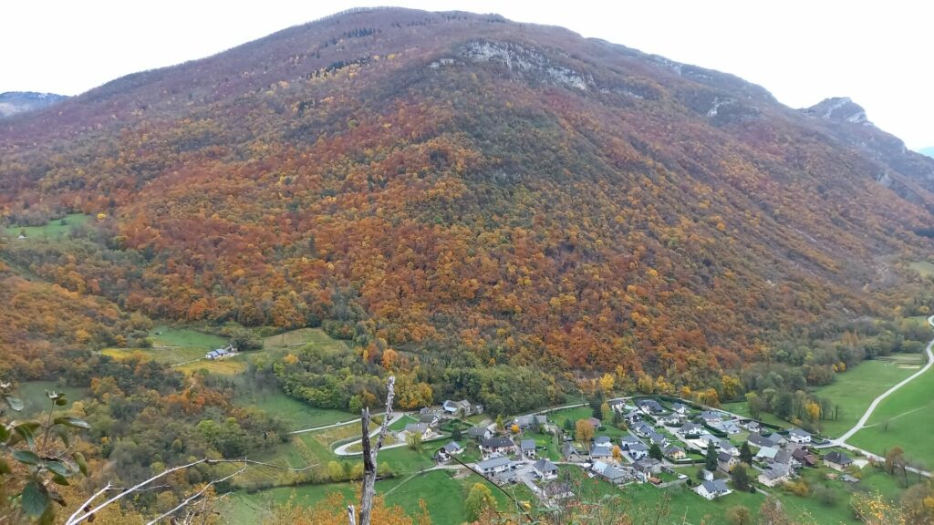 Nous entamons une longue descente entre prairies et forêts par un sentier large menant au hameau de Montgelas(816m), puis jusqu’au hameau du Fornet(590m).