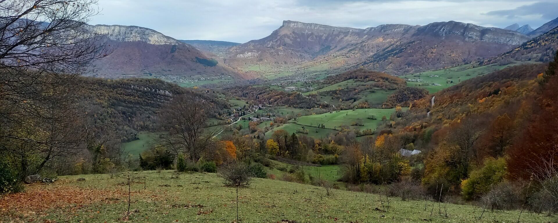 Nous entamons une longue descente entre prairies et forêts par un sentier large menant au hameau de Montgelas(816m), puis jusqu’au hameau du Fornet(590m).