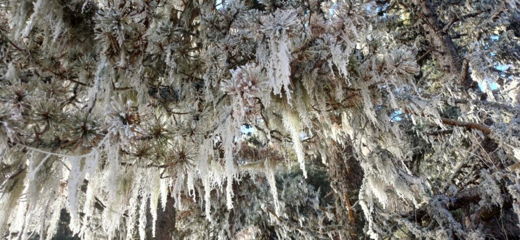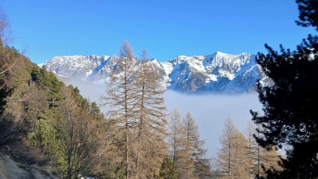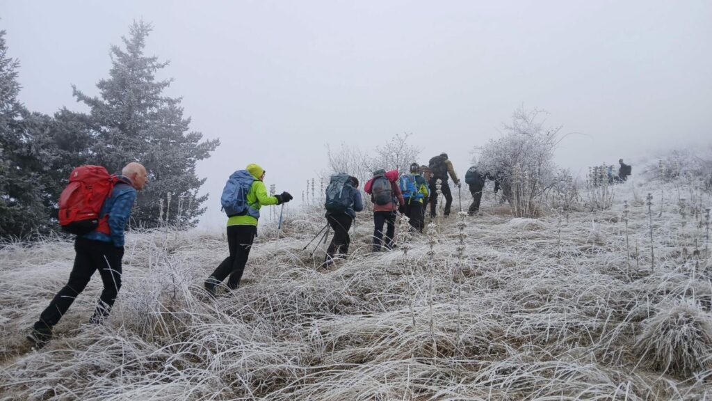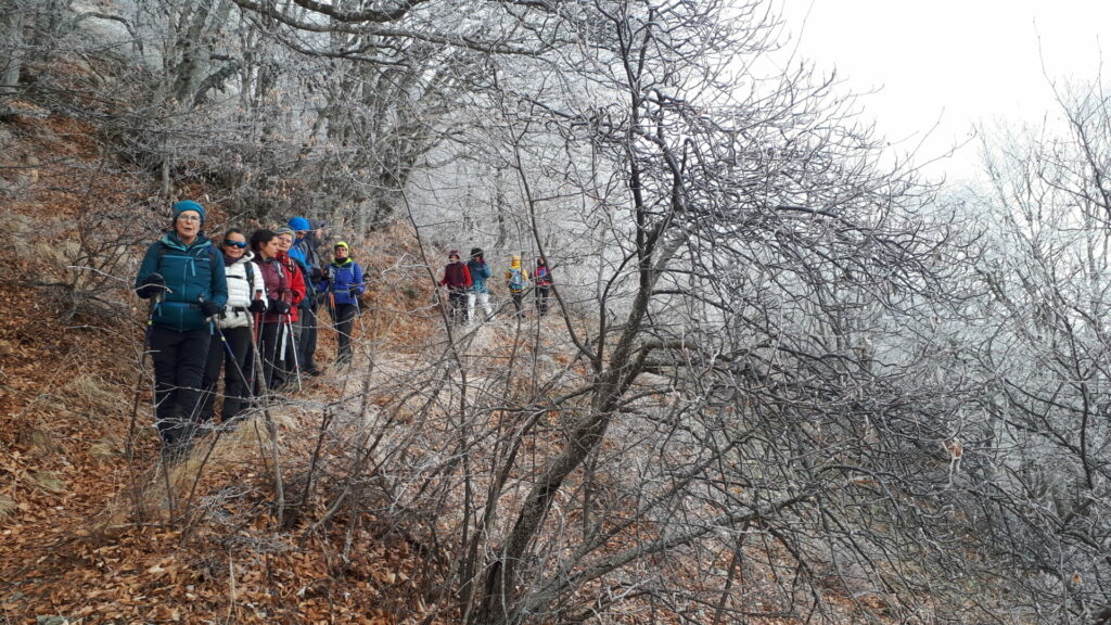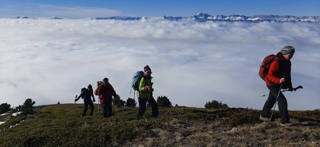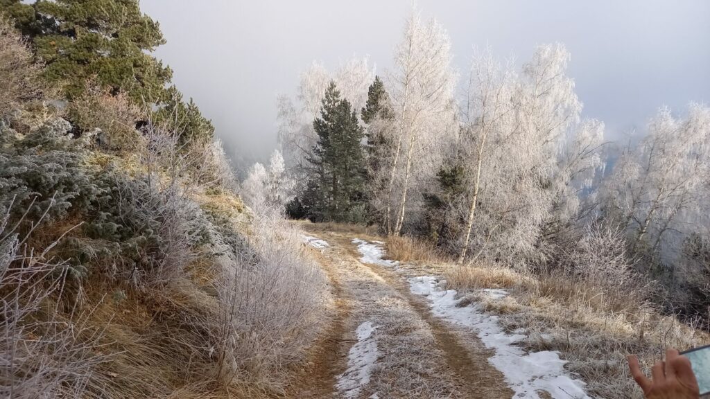 Donc vers 9h30 avec une température d’environ -4°nous démarrons du Col de Malissol (1200m) par une montée sur une croupe forestière bien soutenue . et sous une mer de nuages peu dense, mais bien accrochée….