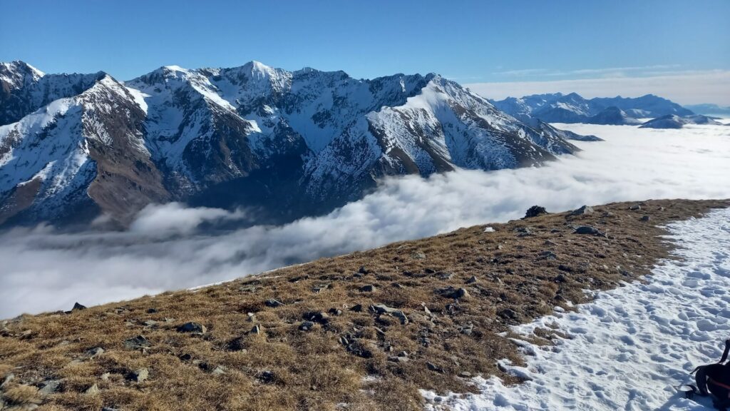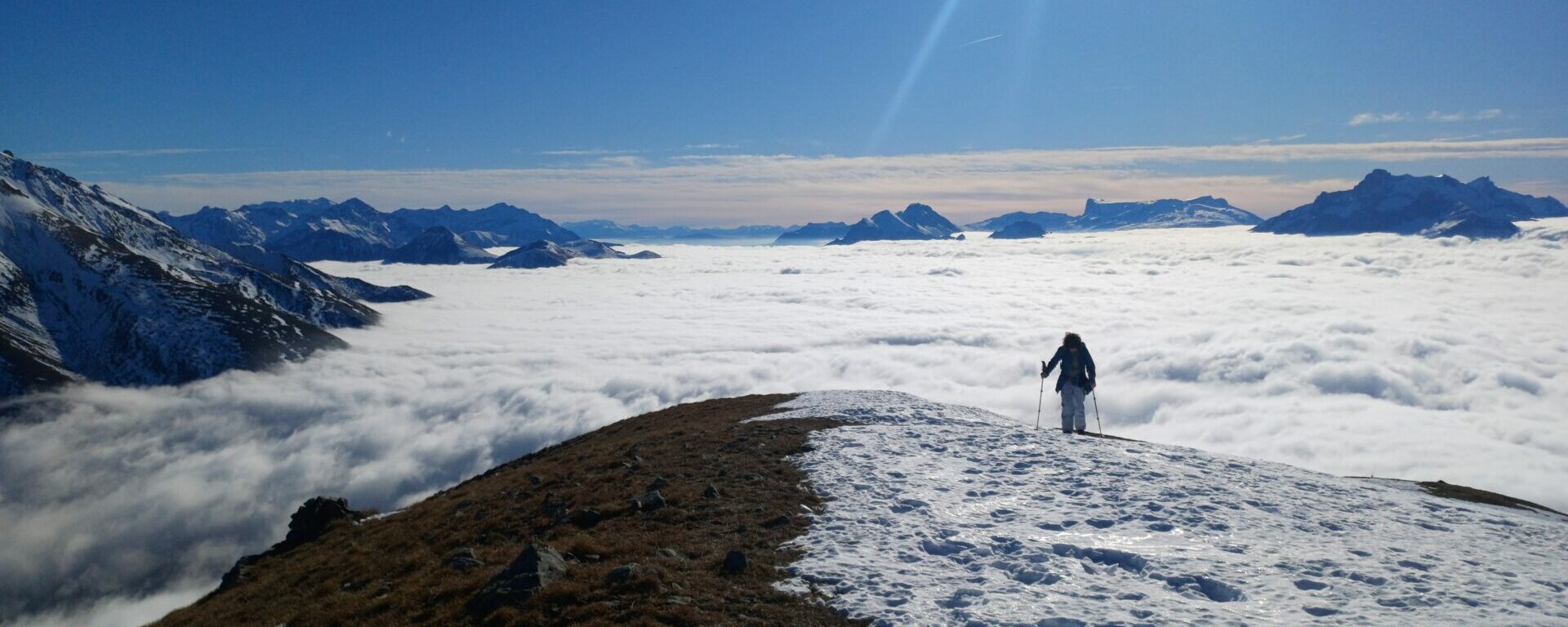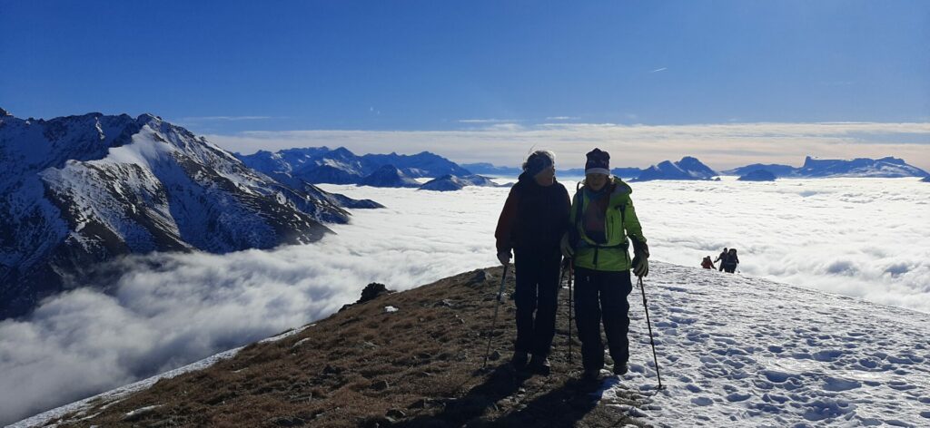 Quelle merveille de pouvoir profiter pleinement des sommets qui sortent, comme de véritables îles, de cette mer de nuages… Nous mémorisons ces instants avec d’autant plus de plaisir que la température , au préalable autour de -5° passe brutalement à +5° en plein soleil et sans vent.