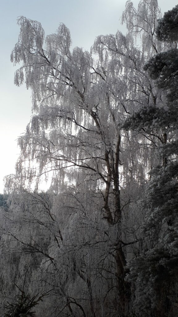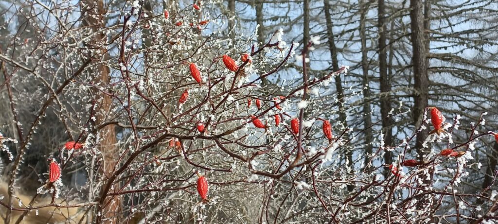 Vers 1800m les crampons devenus inutiles sont remis dans le sac à dos. Nous traversons une forêt magnifique recouverte de givre , puis nous atteignons ainsi La Maison Forestière de Poyet(1650m).