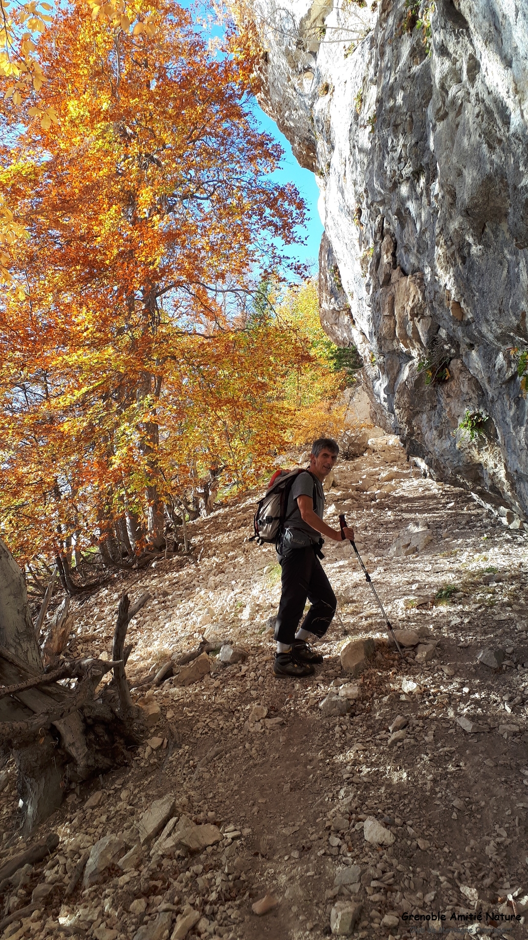 Nous avons finalement choisi l’option via la Grotte des Pouliches, car cette boucle peut se réaliser sans cordes et sans baudrier. Depuis la sortie du topo l’itinéraire a été balisé avec de discrètes marques rouges ; il fut finalement moins compliqué à trouver que nous le pensions. Départ du bois de la Pissarde à St Imbert (près du plateau St Ange), après avoir emprunté plusieurs pistes forestières, nous suivons une sente assez évidente direction Sud que nous quittons vers 1320 m pour poursuivre une vague sente raide sur une croupe boisée, déjà recouverte de feuilles d’automne. Vers 1470 m nous atteignons le pied de la falaise et la grotte des Pouliches, un site remarquable pour sa grande voûte .