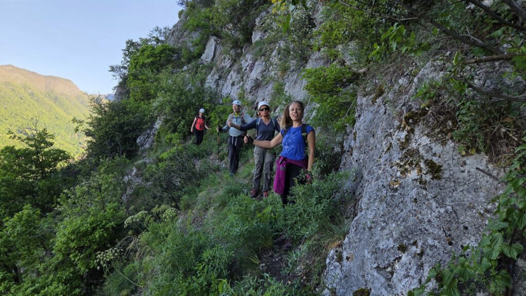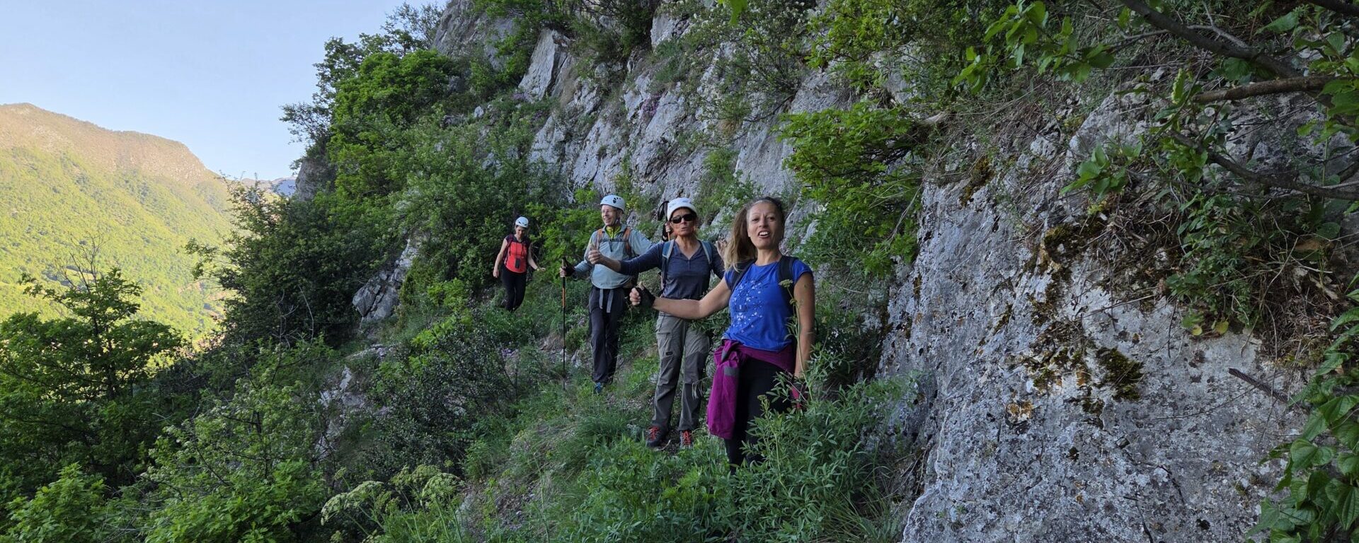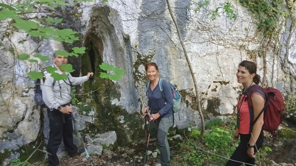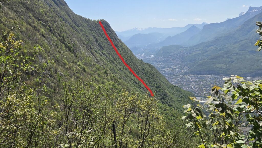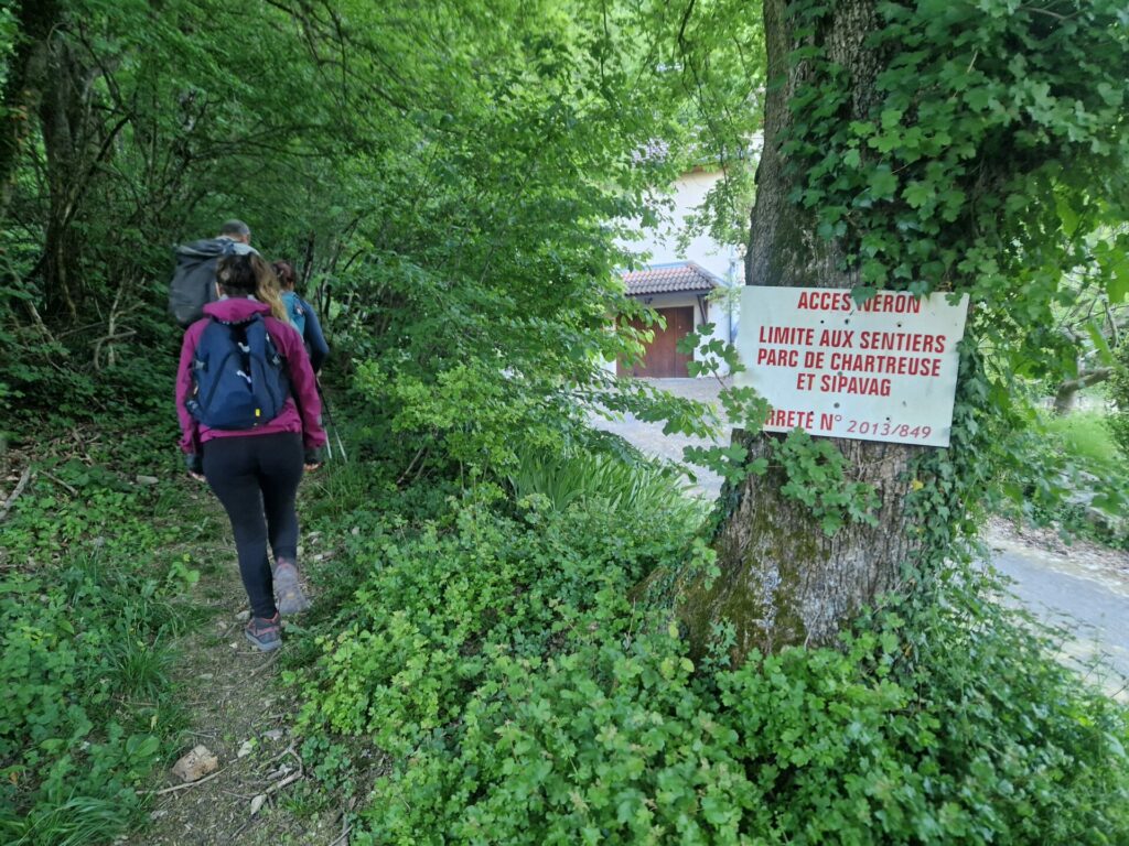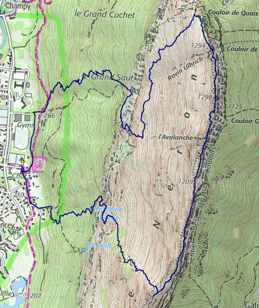 Cela fait très longtemps que je regardais cette face ouest du Néron. Après l’incendie en 2003 elle fut interdite car la face était déstabilisée, ce qui n’est plus le cas actuellement, la forêt a bien repoussé et la face est de nouveau fréquentable. Nous avions fait il y a quelques années le vallon Ulrich ( ) et on se propose aujourd’hui de faire la boucle de la face ouest en utilisant La Fontaine Vierge et le sentier des Charbonniers à la montée et le Grand Saut au retour. On se gare sur le parking de l’école d’escalade et des terrains de sport. C’est une petite équipe motivée et efficace de 5 personnes qui démarre de bonne heure car l’expérience précédente nous avait appris que la face ouest est très chaude et très sèche. Nous avons donc l’avantage de monter à l’ombre et au frais ce matin.