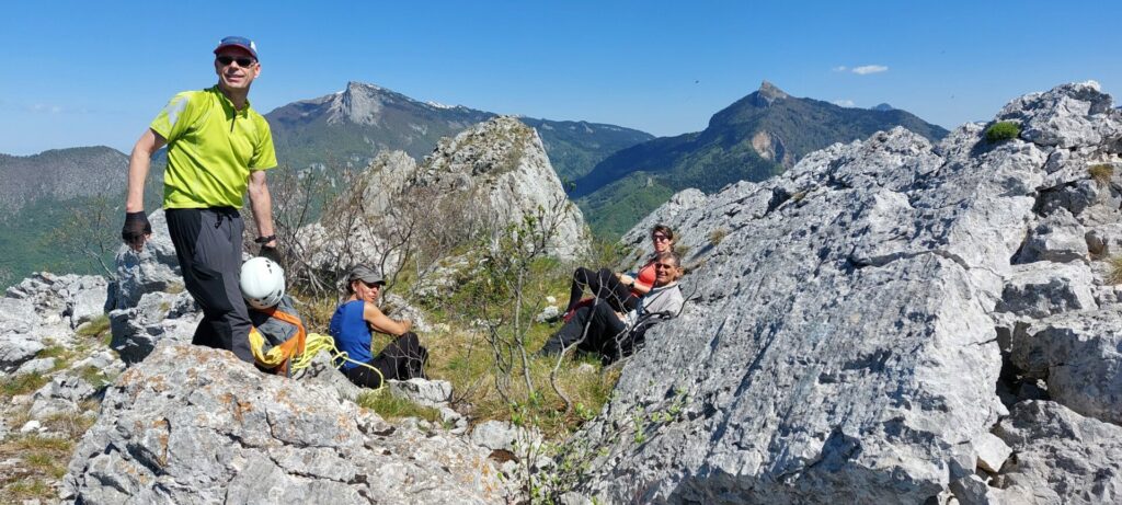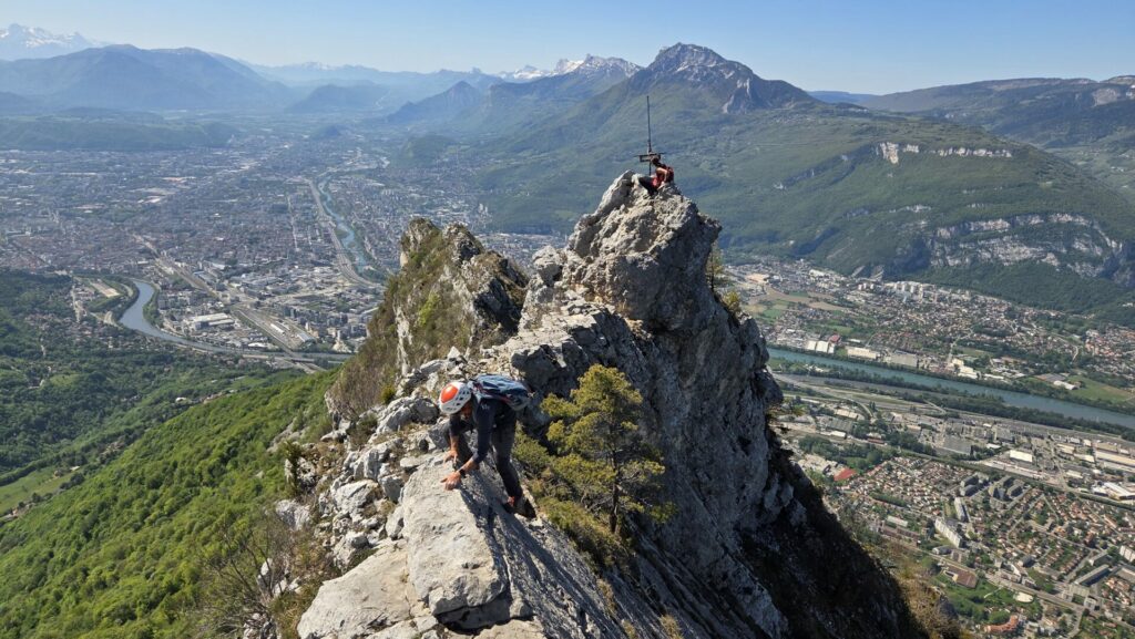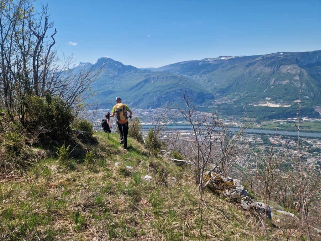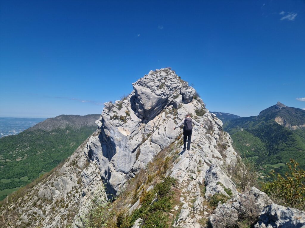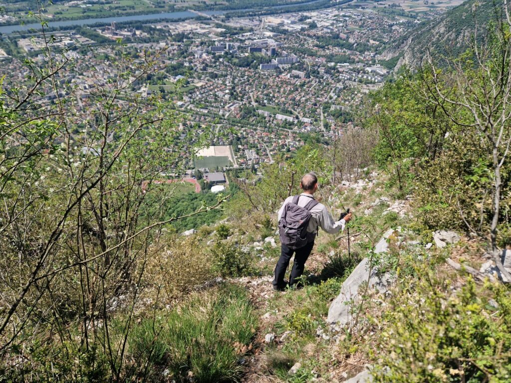 La remontée de l’arête du Néron, la grande classique de ce parcours, est très longue. Nous faisons la pause casse-croûte au sommet à midi. Nous prolongeons la pose car il n’y a pas d’urgence. Nous finissons les arêtes et arrivons au couloir de Clémentière, nous continuons en suivant les marques bleues et en restant sur le fil de l’arête jusqu’à un petit cairn discret d’où part une sente presque horizontale à gauche : c’est le début du sentier de descente. Là encore, bonne surprise, le sentier est assez marqué et les marques bleues suffisamment rapprochées pour suivre l’itinéraire sans trop de difficultés. Il faut rester toutefois très attentif à ne pas sortir du sentier qui est par endroit très peu marqué. Il ne faut pas rater non plus la sortie à droite de ce sentier pour aller vers le Grand Saut (en suivant le sentier on rejoint l’itinéraire de montée). La descente du Grand Saut est peu marquée, assez difficile à trouver malgré les marques bleues (conçues pour la montée) qu’il faut suivre impérativement. Cette partie est raide et malcommode, par endroits un peu engagée. Par chance nous ne ferons pas d’erreur et nous parviendrons rapidement à la corde terminale. À partir de là, nous poursuivons le sentier, d’abord en pied falaise, puis à la descente. Ce sentier est peu fréquenté, peu balisé et par endroits, peu agréable avec des parties déversantes, raides, et en terre. Le sentier a été modifié car il ne suit pas les traces indiquées sur la carte OSM, nous suivons les traces bleues qui nous amènent assez rapidement aux terrains de sport, puis tranquillement au parking.
