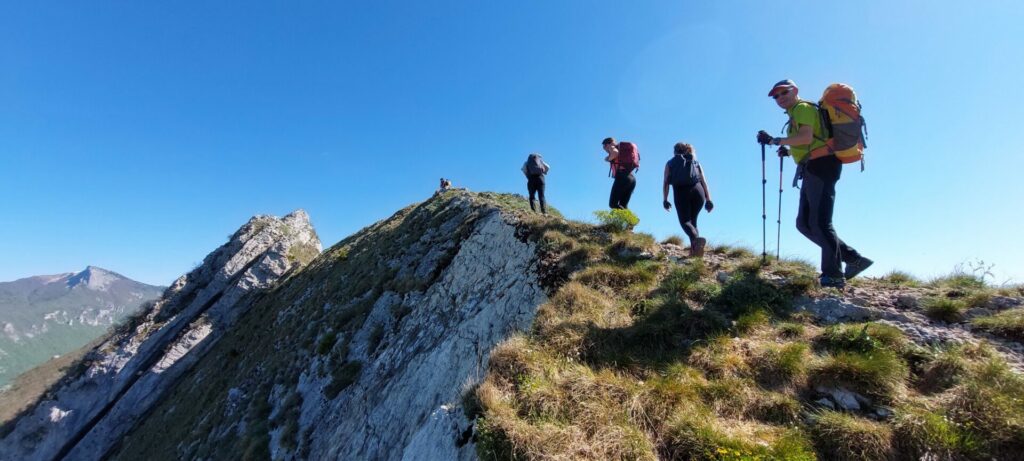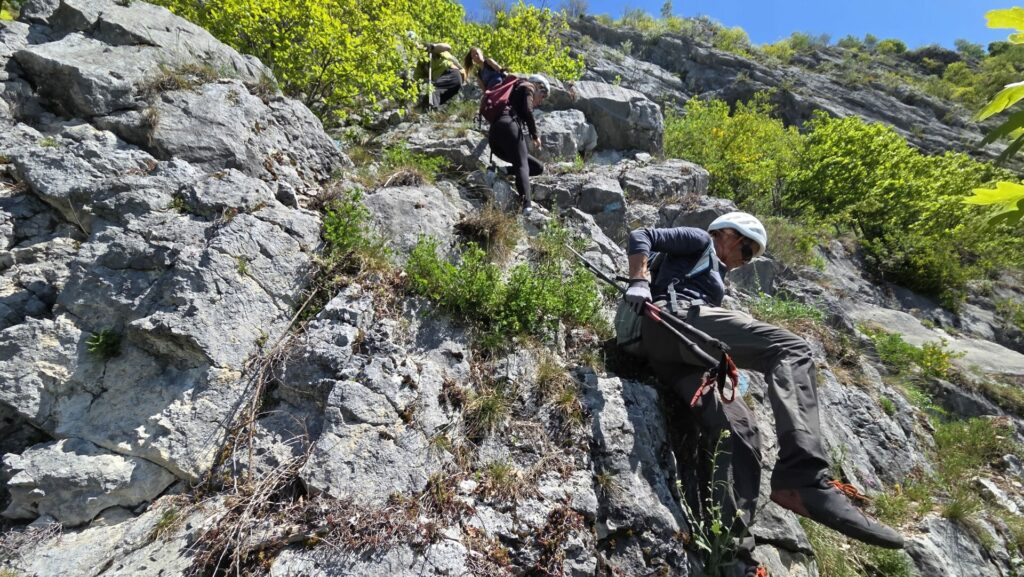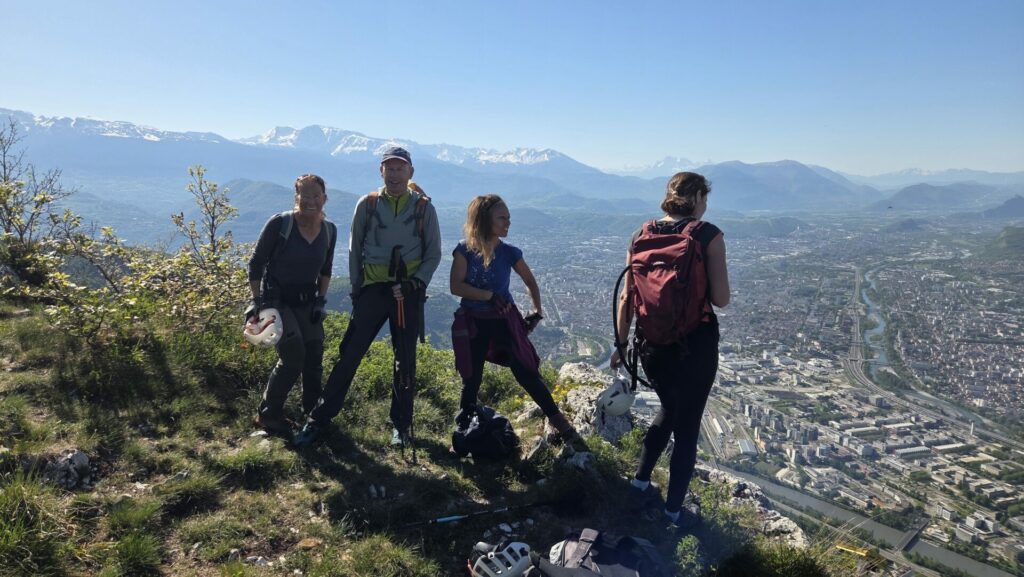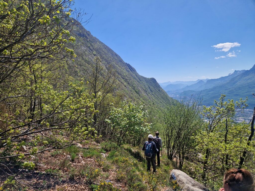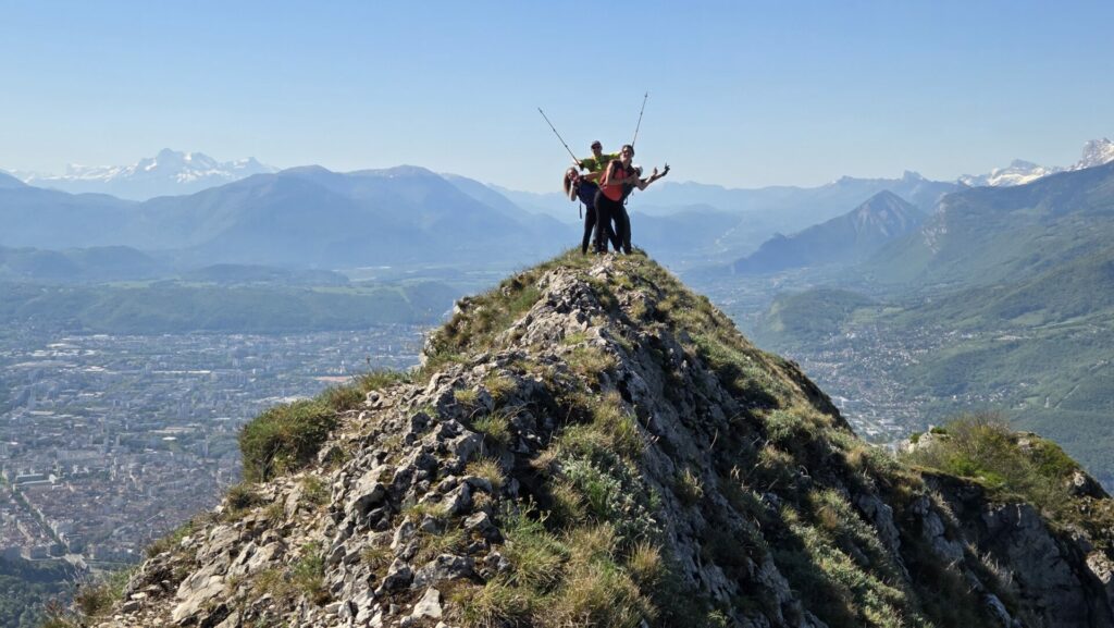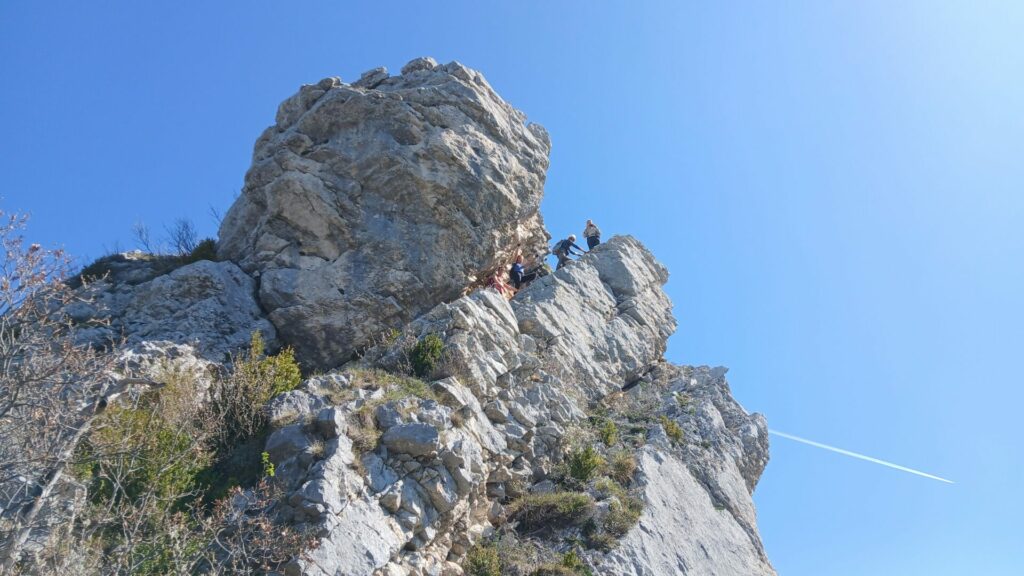 La remontée de l’arête du Néron, la grande classique de ce parcours, est très longue. Nous faisons la pause casse-croûte au sommet à midi. Nous prolongeons la pose car il n’y a pas d’urgence. Nous finissons les arêtes et arrivons au couloir de Clémentière, nous continuons en suivant les marques bleues et en restant sur le fil de l’arête jusqu’à un petit cairn discret d’où part une sente presque horizontale à gauche : c’est le début du sentier de descente. Là encore, bonne surprise, le sentier est assez marqué et les marques bleues suffisamment rapprochées pour suivre l’itinéraire sans trop de difficultés. Il faut rester toutefois très attentif à ne pas sortir du sentier qui est par endroit très peu marqué. Il ne faut pas rater non plus la sortie à droite de ce sentier pour aller vers le Grand Saut (en suivant le sentier on rejoint l’itinéraire de montée). La descente du Grand Saut est peu marquée, assez difficile à trouver malgré les marques bleues (conçues pour la montée) qu’il faut suivre impérativement. Cette partie est raide et malcommode, par endroits un peu engagée. Par chance nous ne ferons pas d’erreur et nous parviendrons rapidement à la corde terminale. À partir de là, nous poursuivons le sentier, d’abord en pied falaise, puis à la descente. Ce sentier est peu fréquenté, peu balisé et par endroits, peu agréable avec des parties déversantes, raides, et en terre. Le sentier a été modifié car il ne suit pas les traces indiquées sur la carte OSM, nous suivons les traces bleues qui nous amènent assez rapidement aux terrains de sport, puis tranquillement au parking.