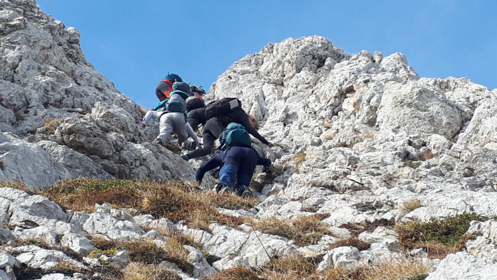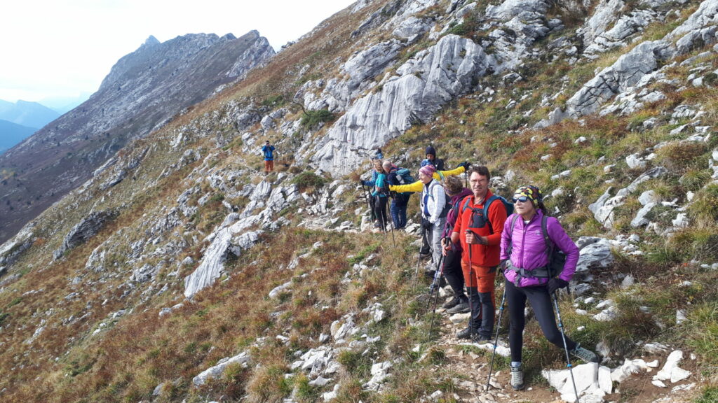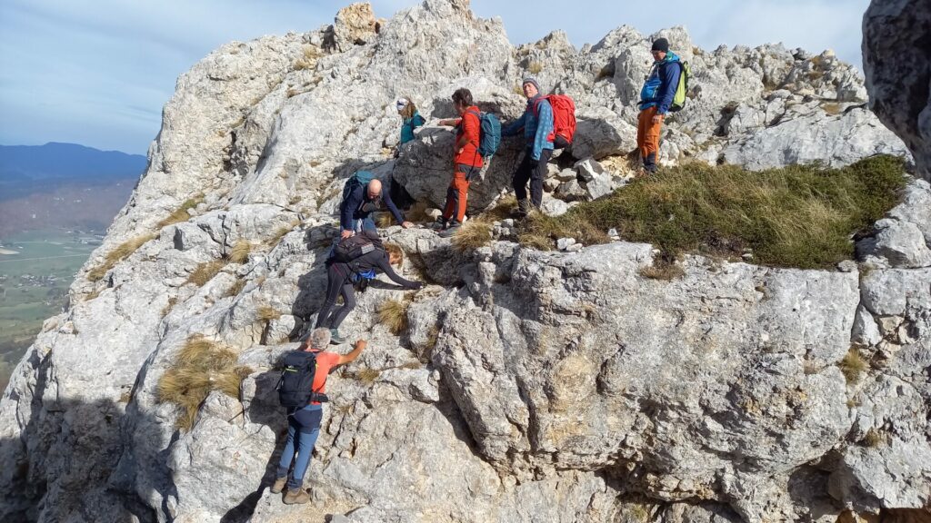 Après environ 40 mn de marche et 100m de remontée nous atteignons la bifurcation en direction du Roc de Cornafion: il nous reste 150m de montée d’abord sur un sentier marqué et régulier, puis à 30 m sous le sommet, nous laissons les bâtons pour gravir une paroi en escalier, plus raide, où il faut mettre les mains.