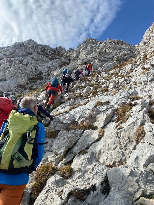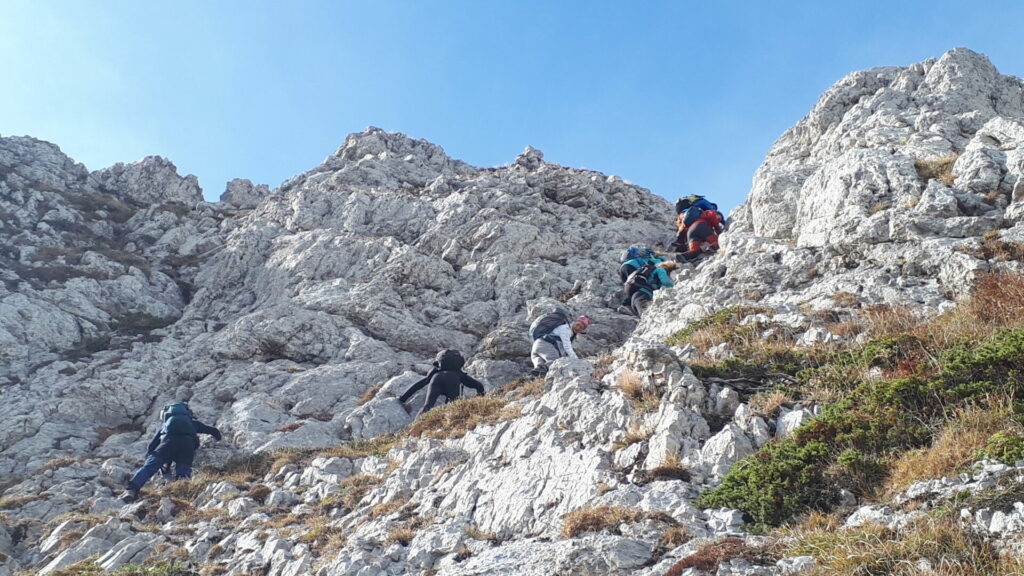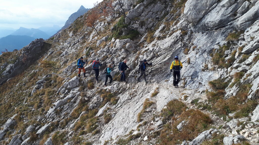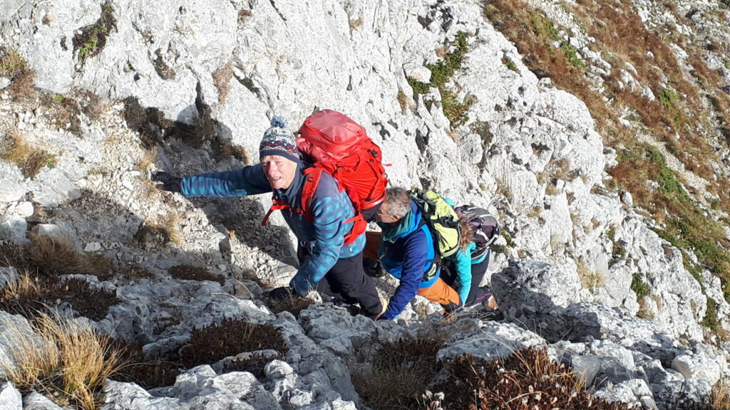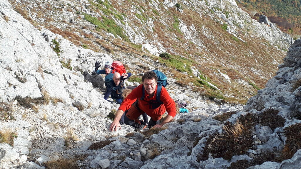 Le sentier est bien marqué et bien balisé de récents traits rouges. Toutefois son profil accidenté, avec des marches, des montées et descentes, des passages d’éboulis ralentissent l’évolution ; et surtout nous devons maintenir la vigilance et la concentration en permanence. Trois bouquetins, sous notre sentier, ne sont pas effarouchés par notre passage.