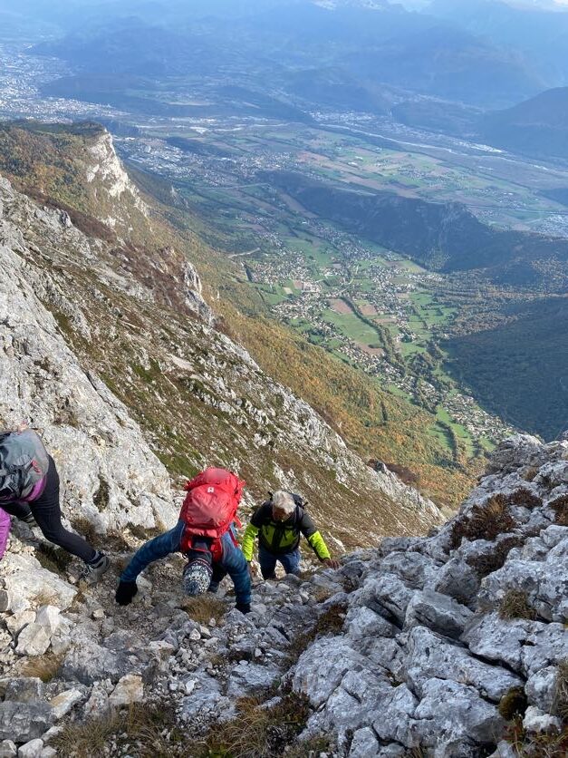 Un petit tour d’horizon, et repartons en sens inverse, avec la descente à la brèche, la remontée et surtout les 30 m de redescente en désescalade prudente et concentré sur les bons gestes, pour ne pas envoyer de petits cailloux sur le voisin du dessous.