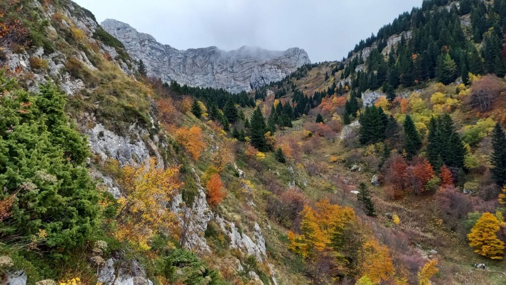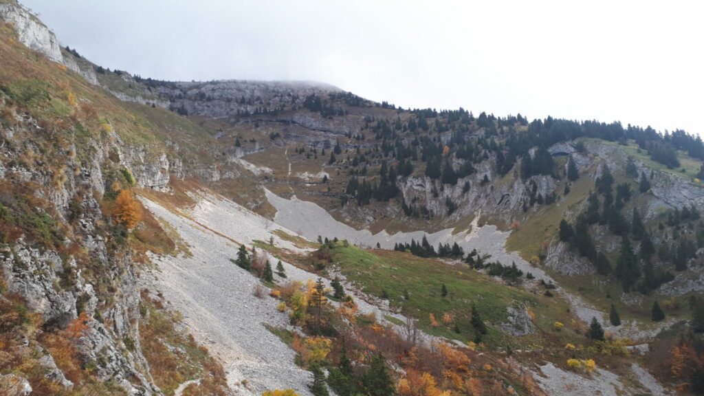 Le retour s’effectue sur ce joli sentier balcon entre forêt aux couleurs de l’automne, et combes dégagées.