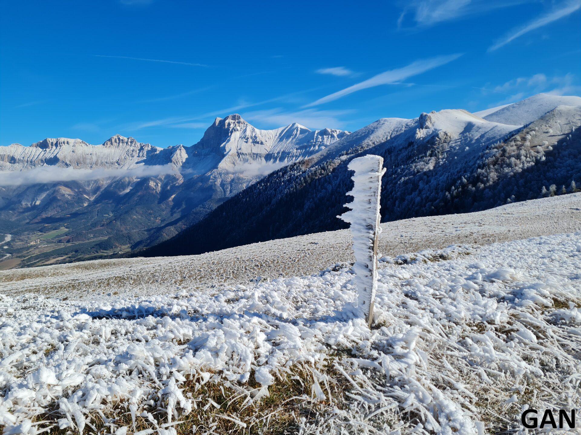 Nous poursuivons sur la jolie crête de Côte Belle sur laquelle l’herbe et et rochers sont recouverts de près de 4 cms de givre.