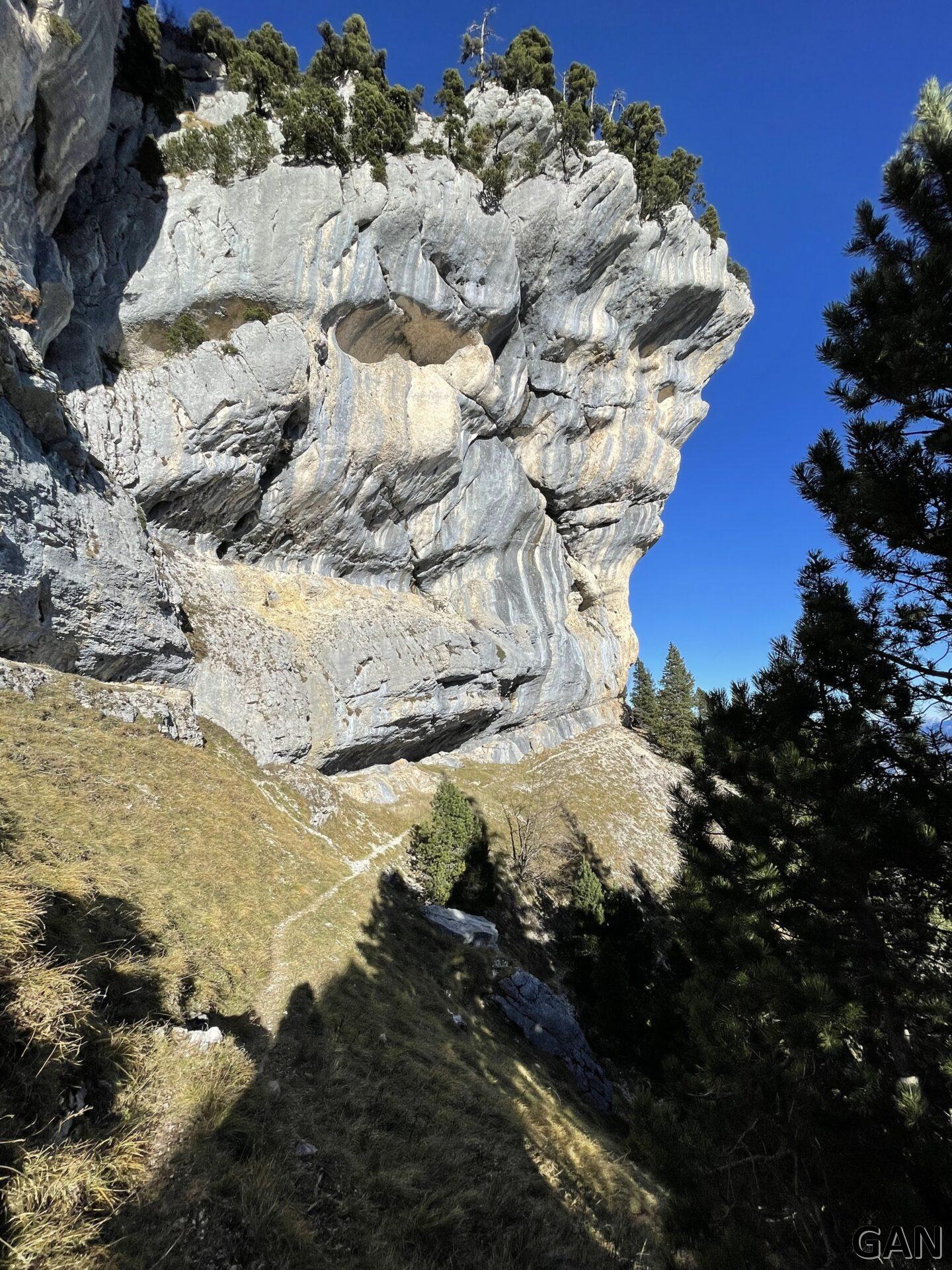 Le sentier est sec, la température est agréablement douce, le soleil est omniprésent sur ce versant est des falaises. La neige n’a pas tenu , sauf sur de toutes petites surfaces dans les cirques orientés Nord/Est.