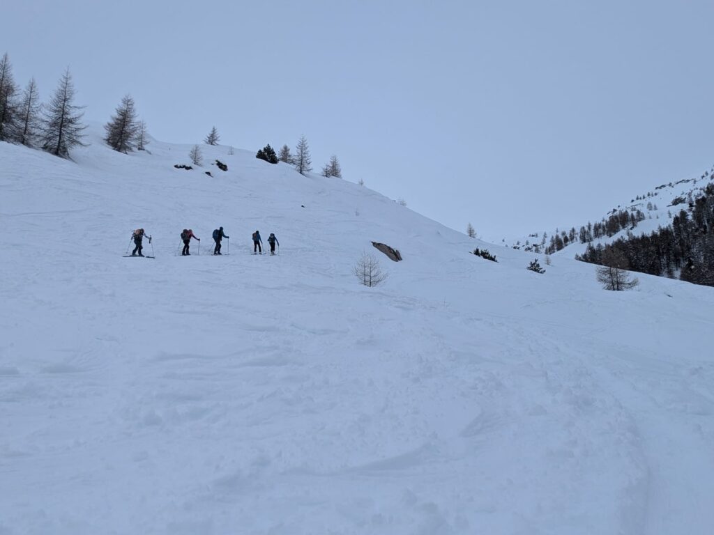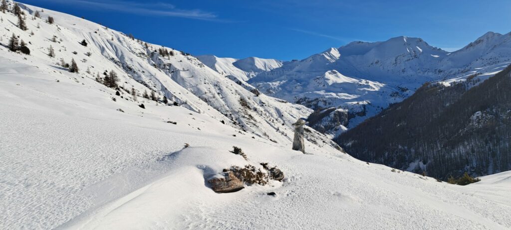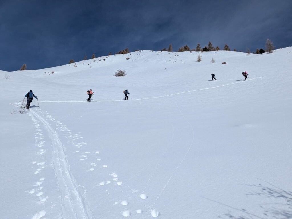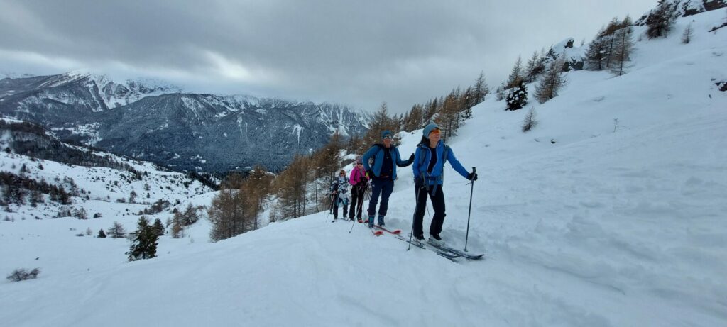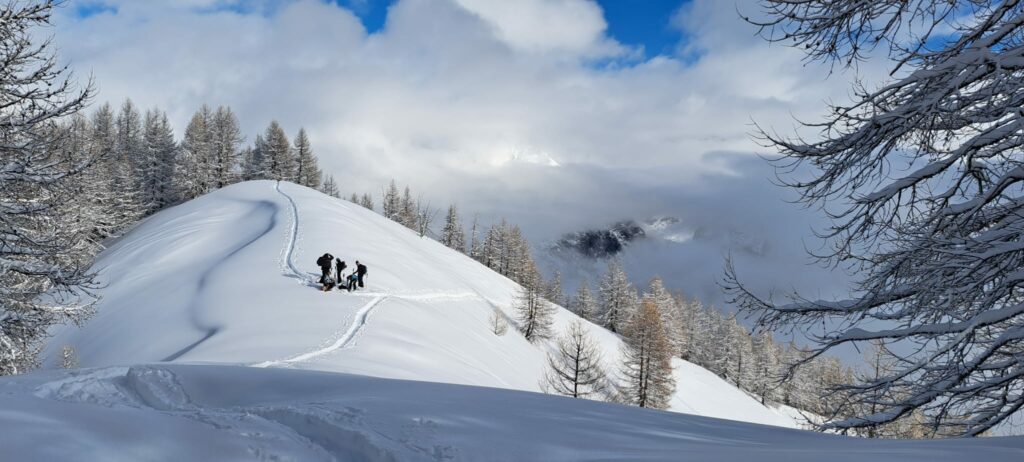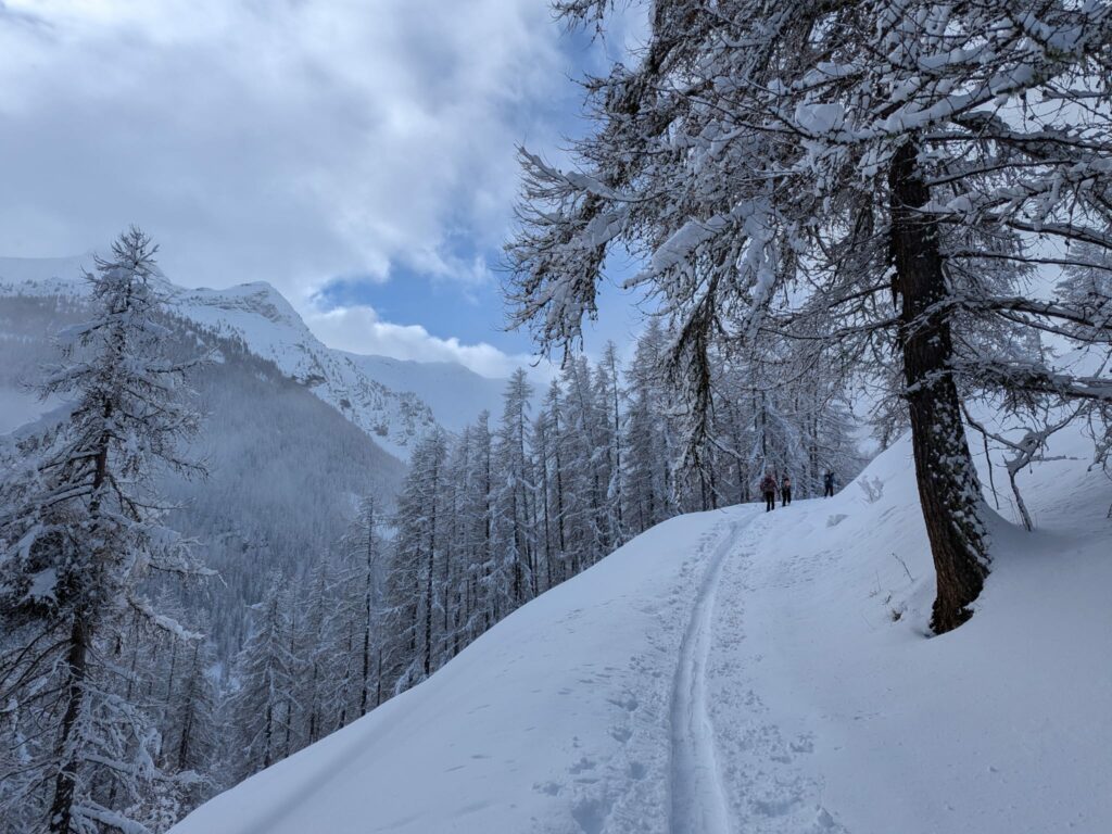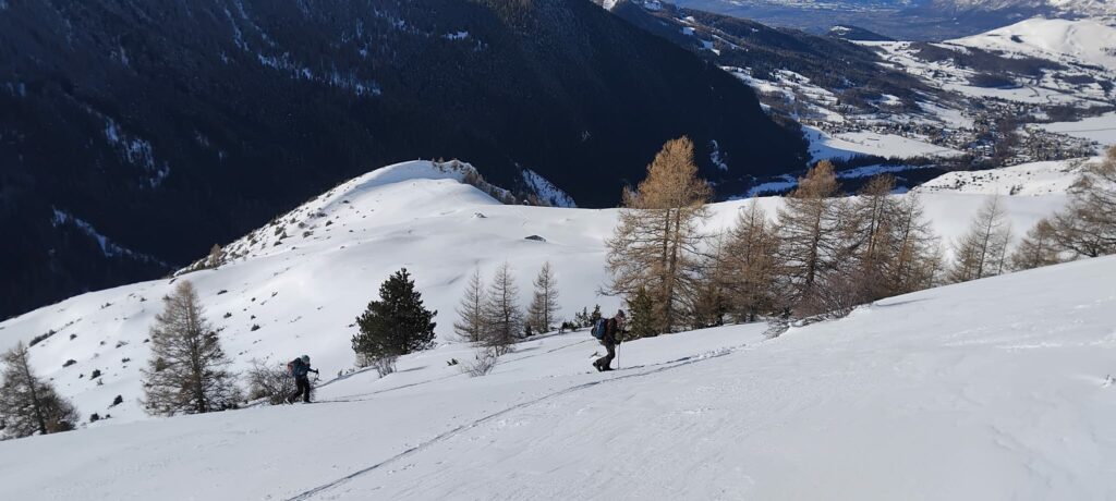 Après une montée régulière dans les mélèzes, nous arrivons au niveau d’une croupe ascendante et le temps se dégage.