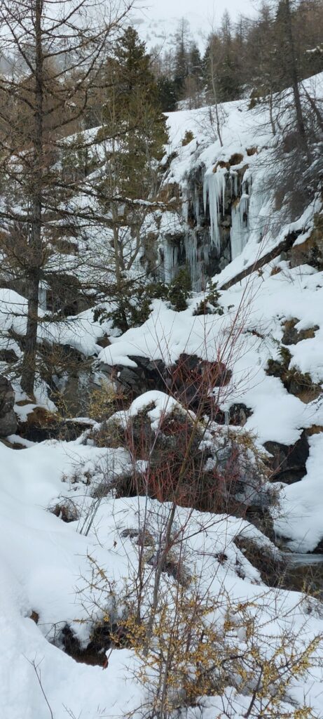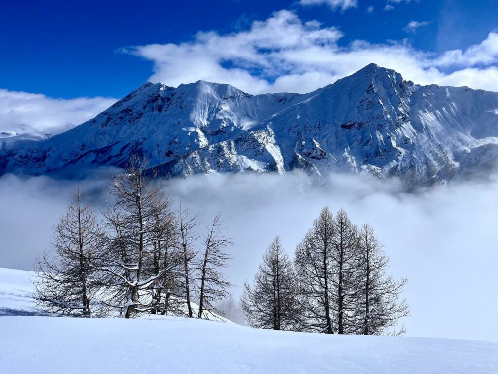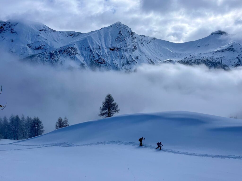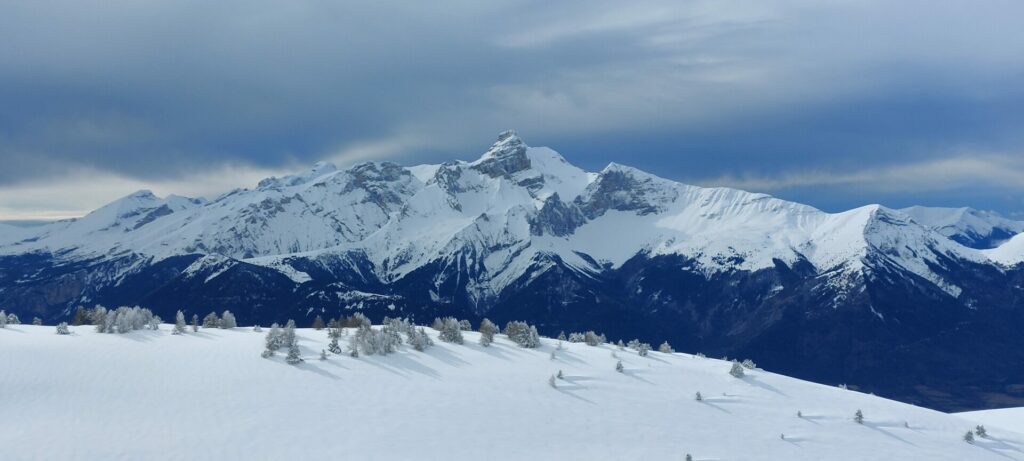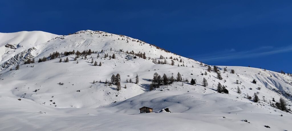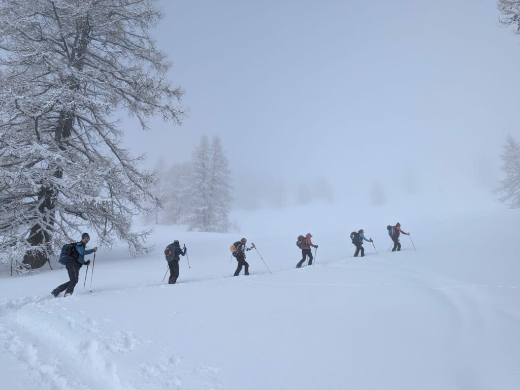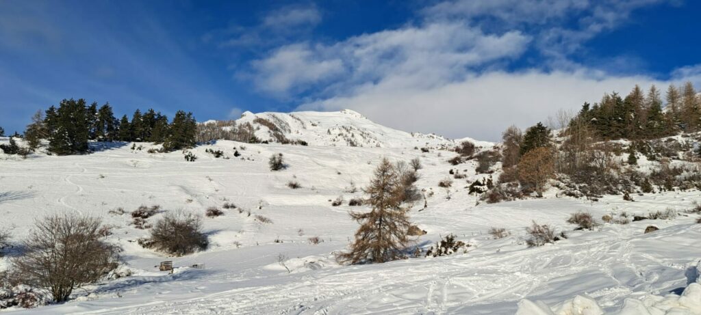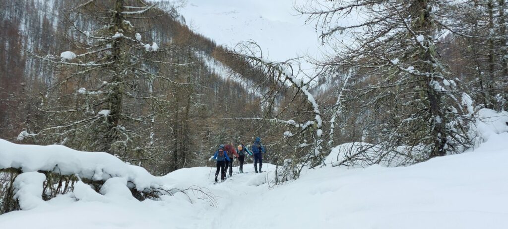 Après une montée régulière dans les mélèzes, nous arrivons au niveau d’une croupe ascendante et le temps se dégage.