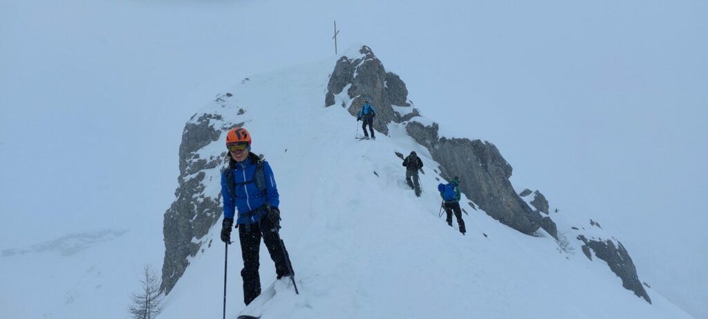 Le sommet plus redressé s’atteint avec les couteaux. Arrêt rapide au sommet (2494m) à cause du vent.