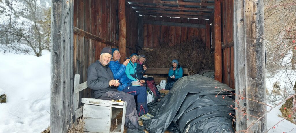 La descente dans la neige transformée est agréable dans ce versant sud où on se sent plus en sécurité. Le pique nique à la cabane du berger à 1800m (ouverte) est fort apprécié.
