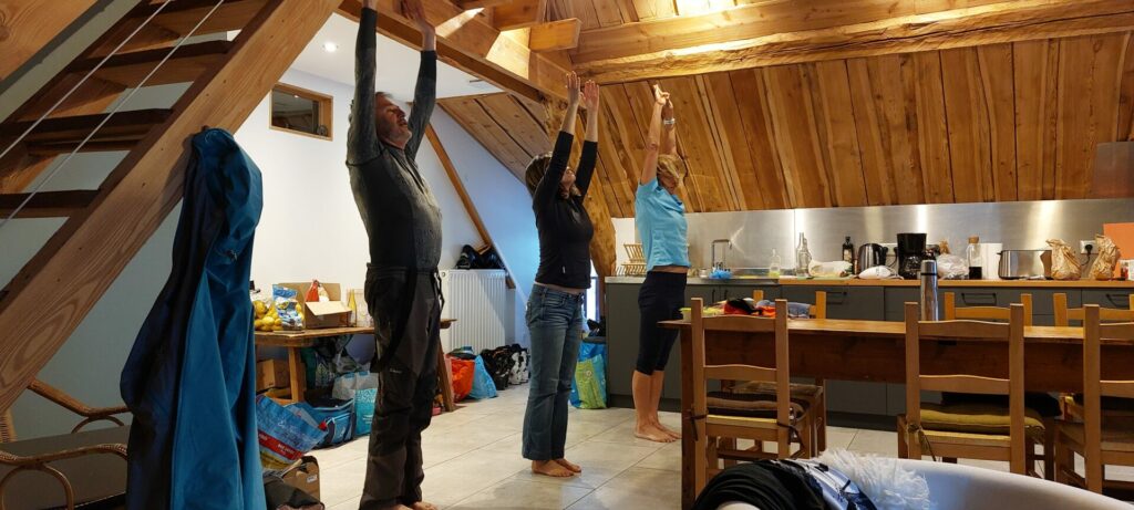 Stéphanie prend la direction d’une séance d’étirements avant une soirée gastronomique, avec un Rougail diots d’Eric et des iles flottantes de Véro.
