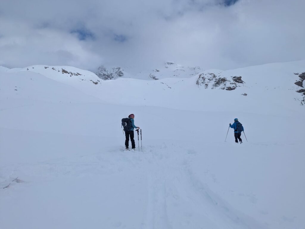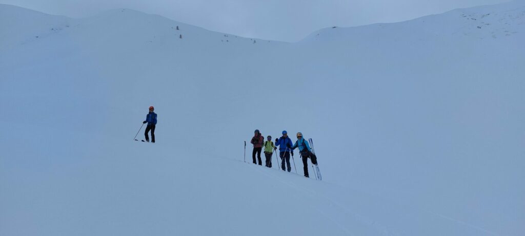 Nous démarrons au soleil à 9h35 en direction de la cabane de Pierre Drue mais nous sommes rattrapés par un brouillard dense à 2200m. Nous choisissons de dépeauter pour profiter de la poudreuse et de la visibilité dans une jolie combe puis nous repeautons jusqu’au sommet du Palastre (2278m).
