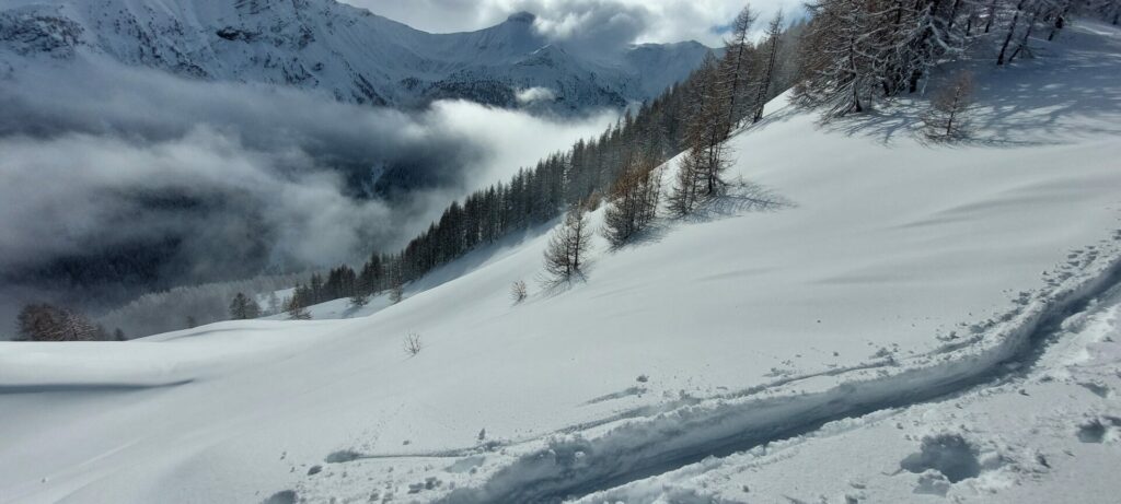 Descente dans 50 cm de poudreuse 5 * mais la neige s’alourdit vers 1900m.