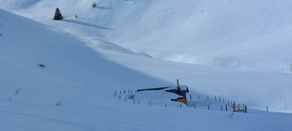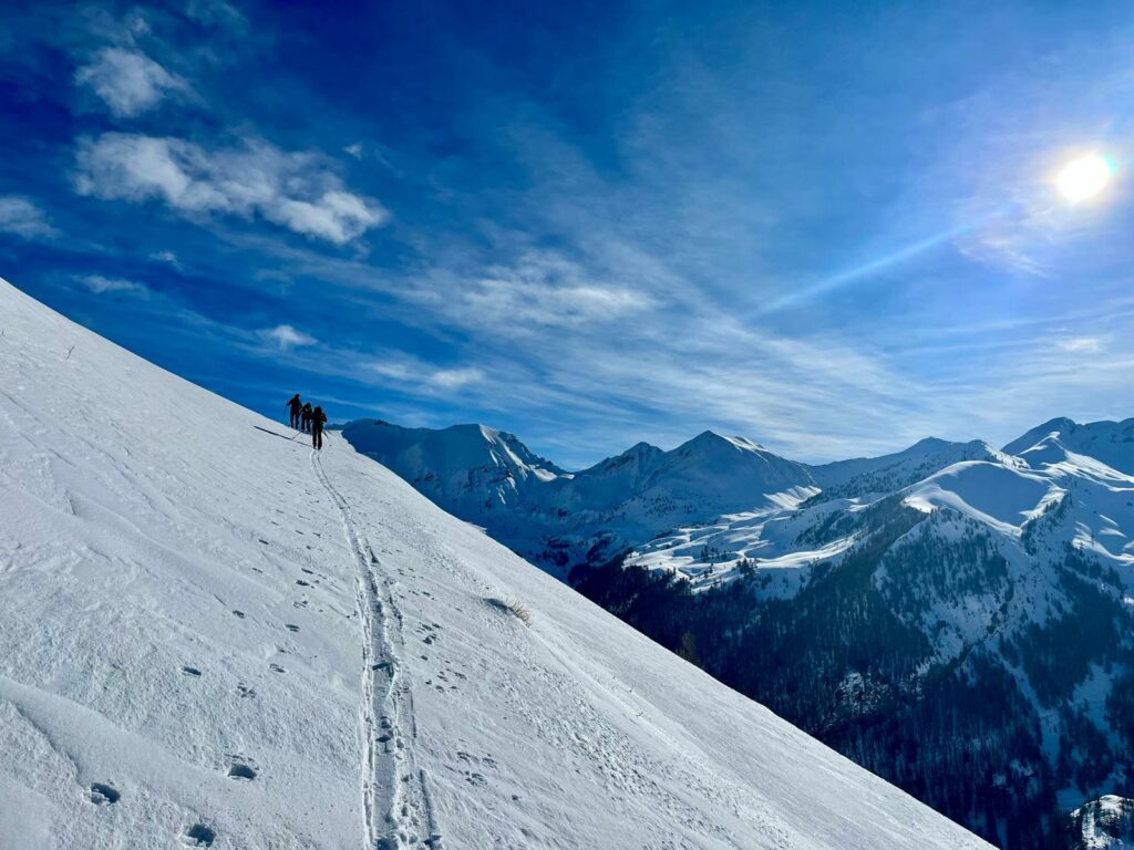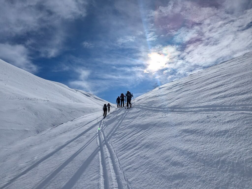 Direction la Recula (2420m) depuis le hameau d’Archinard à 10h. Nous commençons par faire une trace dans la neige profonde mais heureusement des jeunes du coin vont nous remplacer.